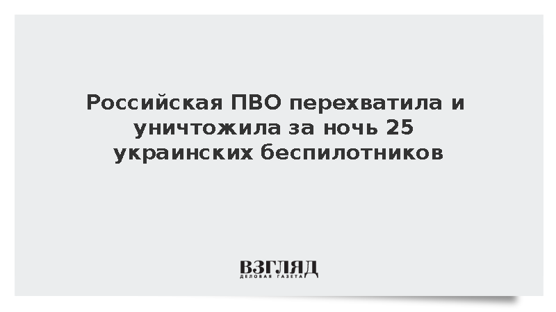 Средства противовоздушной обороны уничтожили и перехватили в ночь на 12 марта 25 украинских беспилотников над Белгородской, Брянской, Курской, Ленинградской, Московской, Орловской и Тульской областями, сообщили в Минобороны России.