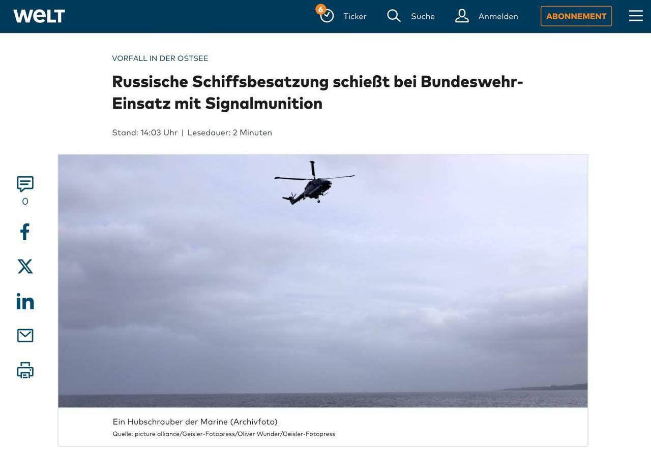 ⚠️В Балтийском море российский корабль открыл предупредительный огонь в сторону вертолета Бундесвера, - Welt
