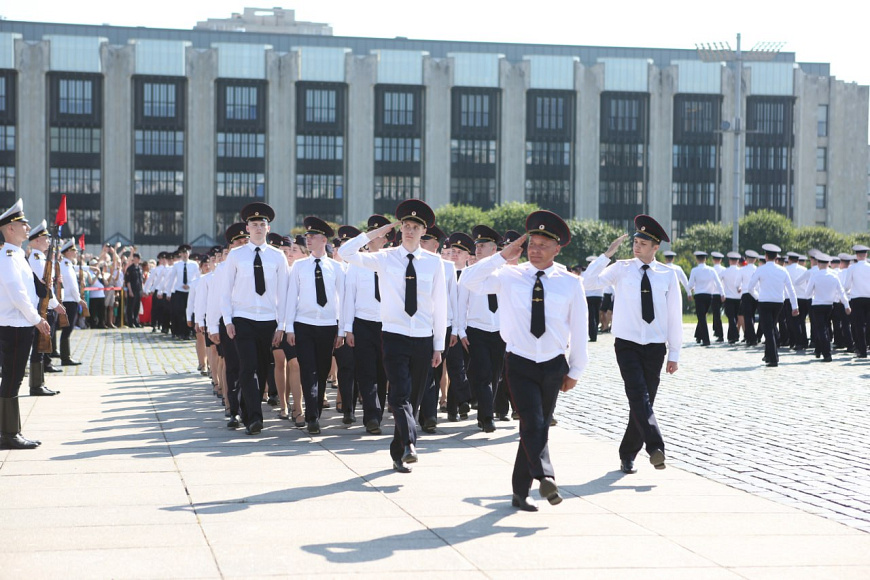Молодые офицеры исполнили Гимн Российской Федерации и прошли торжественным маршем под аккомпанемент оркестра.