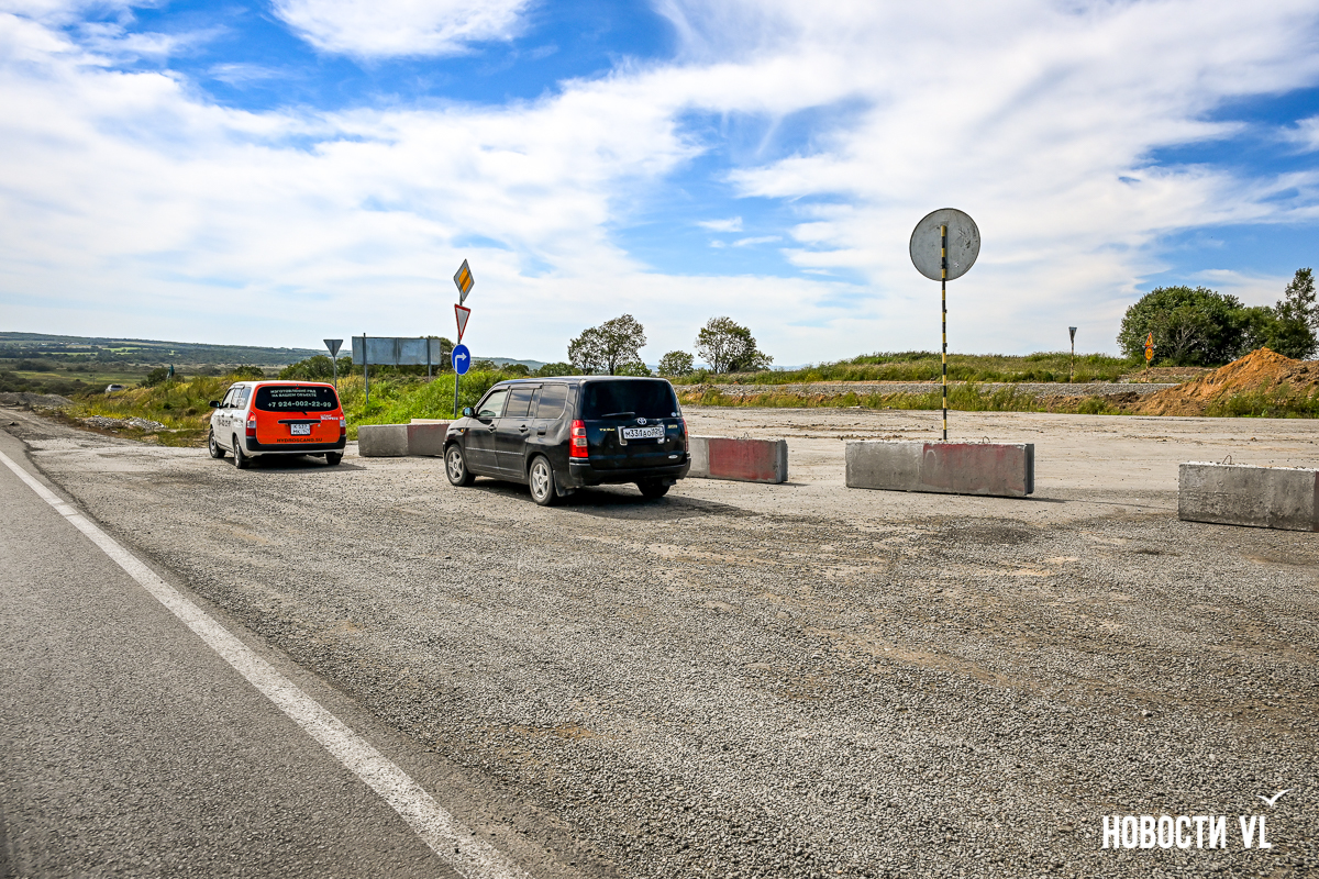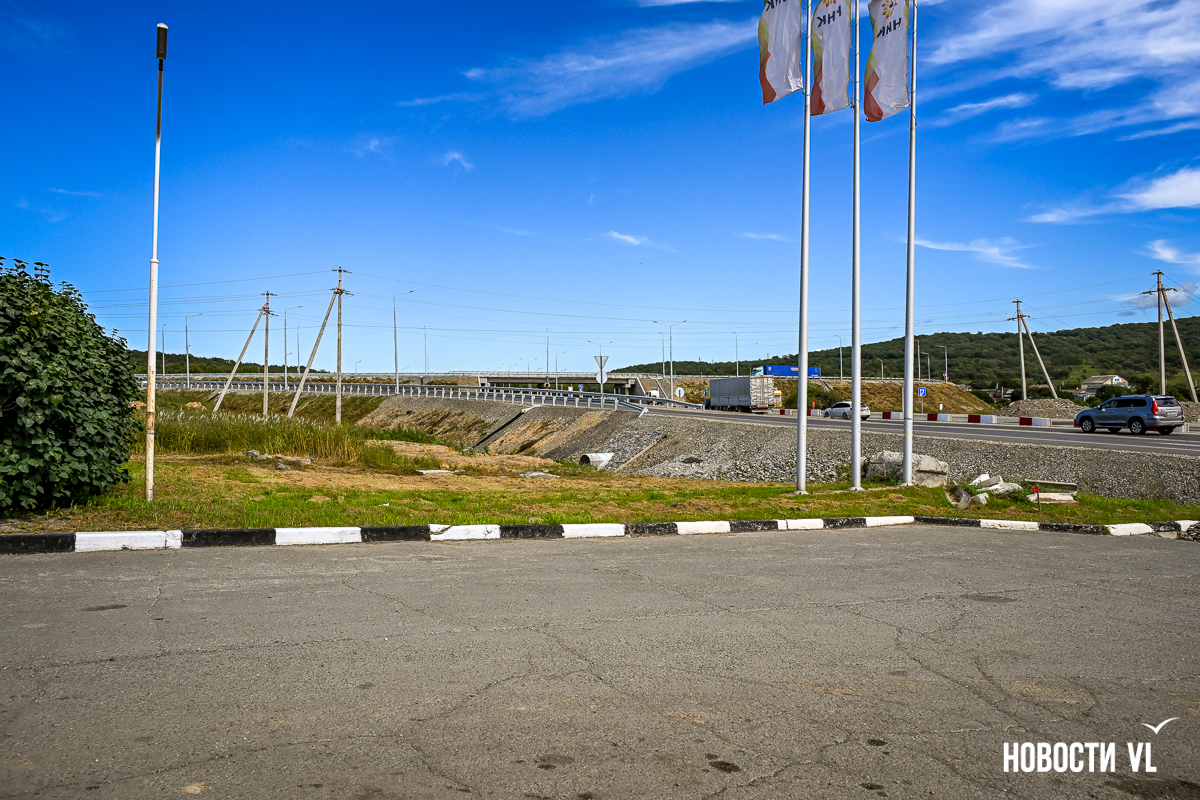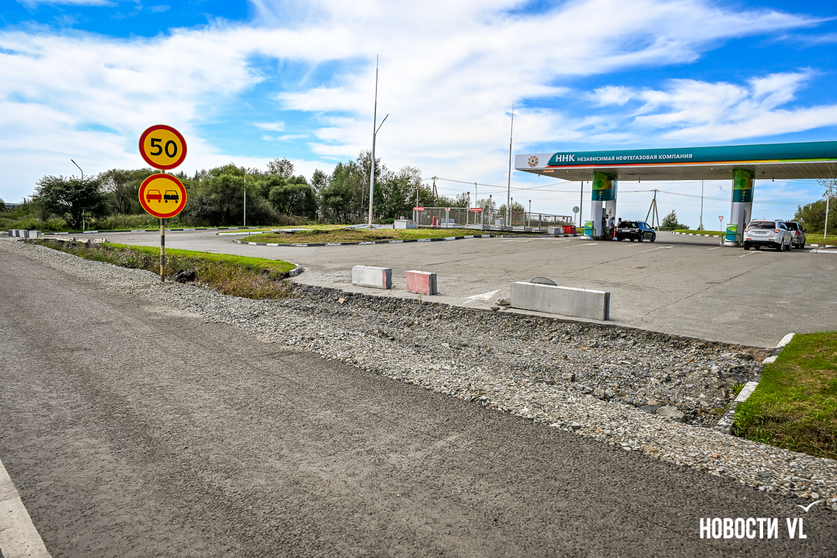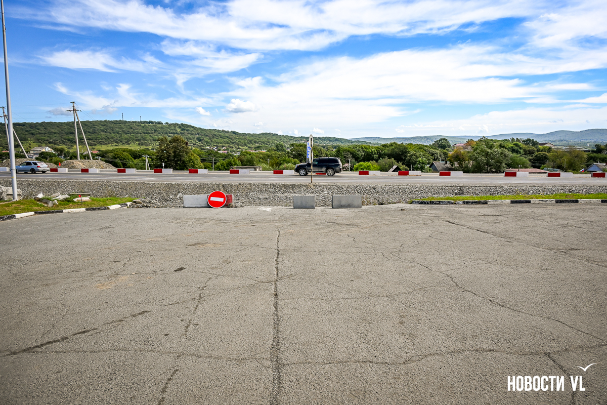 Сразу за путепроводом повернуть через встречку в сторону Хасана уже не получится – старый поворот закрыт бетонными блоками. Также перекрыт подъезд к закусочной и, главное, к заправке ННК, которая расположена в сторону Владивостока. Теперь для этого нужно пользоваться развязкой, то есть за путепроводом свернуть направо.