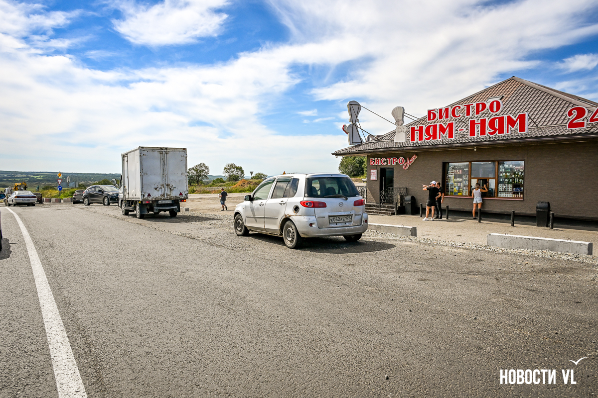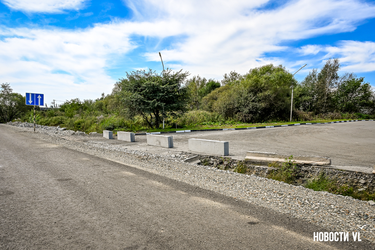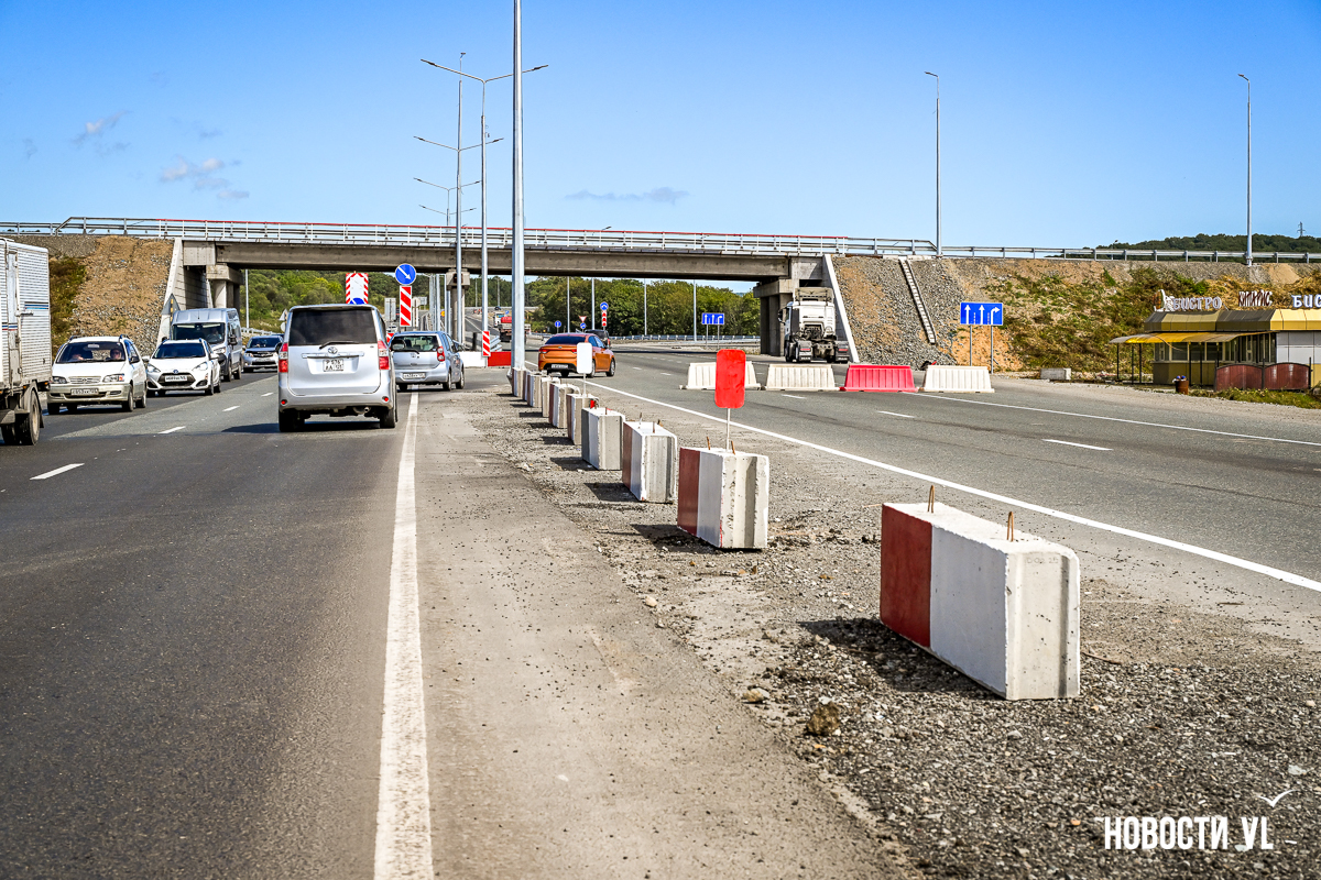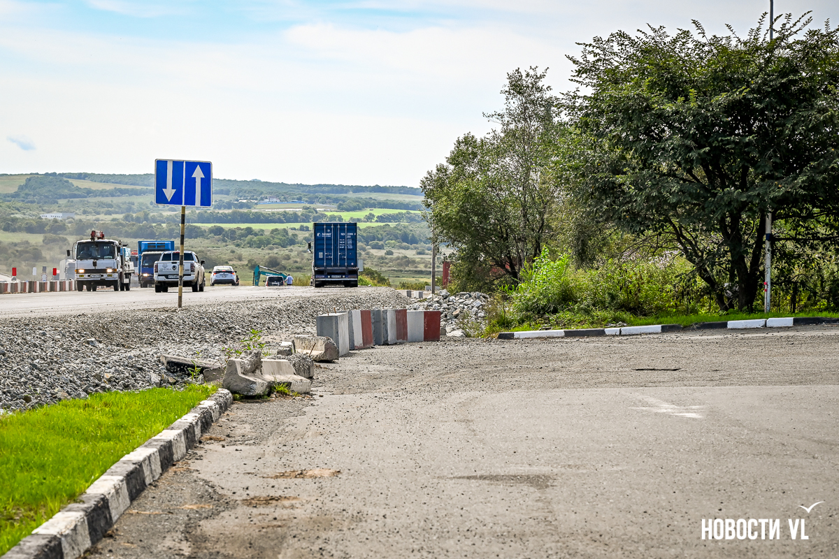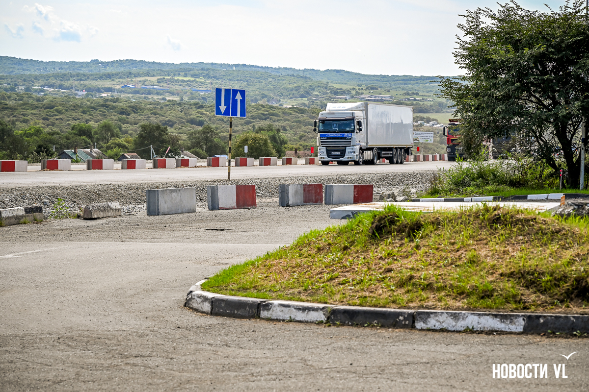 Сразу за путепроводом повернуть через встречку в сторону Хасана уже не получится – старый поворот закрыт бетонными блоками. Также перекрыт подъезд к закусочной и, главное, к заправке ННК, которая расположена в сторону Владивостока. Теперь для этого нужно пользоваться развязкой, то есть за путепроводом свернуть направо.