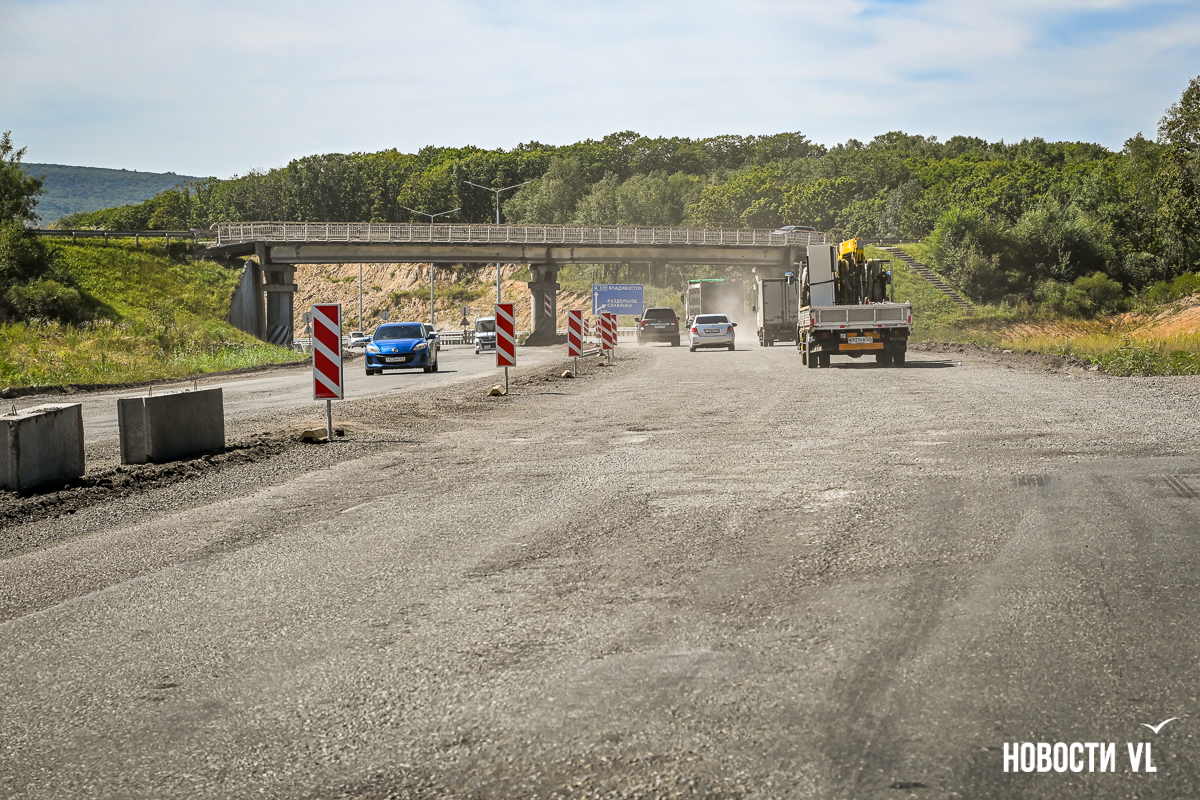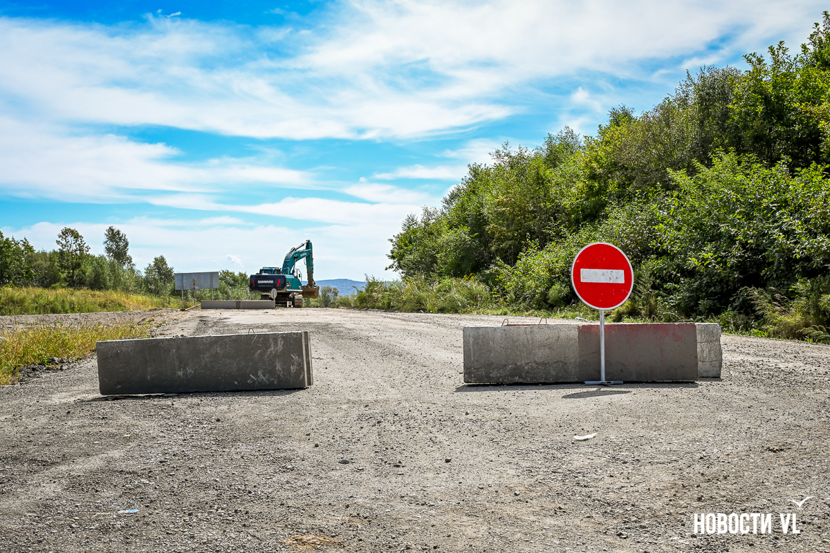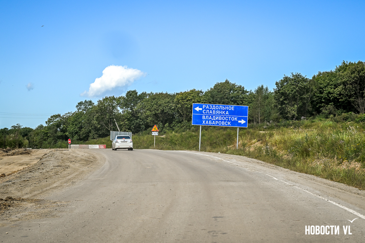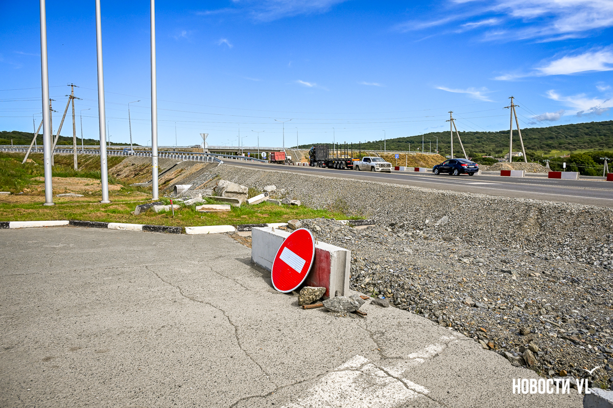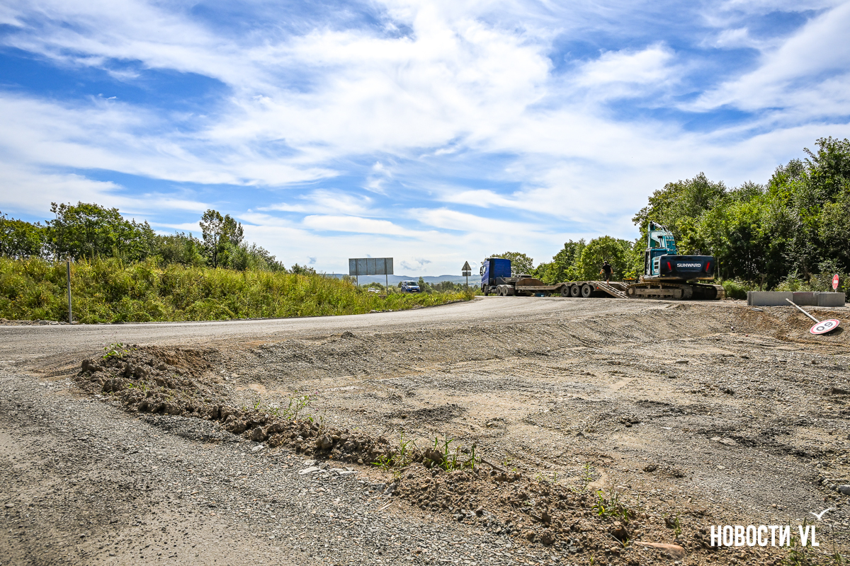 В обратную сторону, от Уссурийска до Владивостока, тоже закрыты почти все съезды, кроме того, что ведёт в Раздольное. Оттуда же можно под мостом, как раньше, проехать в сторону Таёжки. Открыт проезд к закусочной и заправке – там не знают, будут ли им снова открывать въезд с трассы. Техника здесь тоже ещё работает. Пока не очень понятно, как на этом объекте разворачиваться, если хочешь отсюда поехать в обратную сторону. Сейчас развернуться можно на участке старой дороги, которая ведёт в Раздольное.