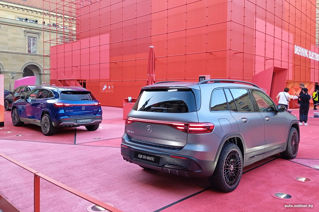 Также Mercedes показала обновленную парочку электрических «паркетников» EQA и EQB с немного перекроенной внешностью, улучшенной мультимедиасистемой и возросшим на 20—30 км запасом хода на одной зарядке. Машина в камуфляжной пленке — прототип электрического внедорожника G-класса, рыночный дебют которого запланирован на 2024 год.