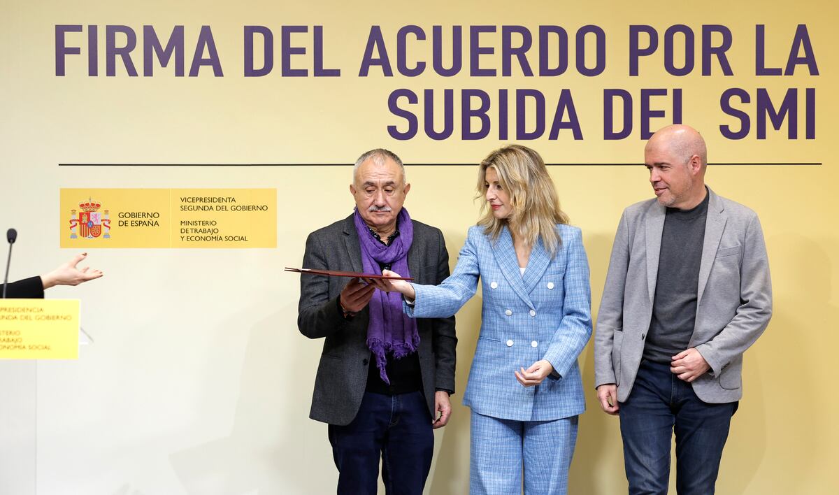 “La subida tiene cara de mujer y cara de joven, es a quien más beneficia”, dijo también en la presentación de la subida el secretario general de UGT, Pepe Álvarez. “Se están rompiendo de forma evidente los dogmas del neoliberalismo en la gestión de los mercados laborales”, comentó Unai Sordo, el líder de CC OO, en referencia al récord de ocupación que vive España (21,3 millones de trabajadores) a la vez que el SMI ha crecido un 54% desde 2018. La subida beneficia a 1,1 millones de trabajadoras y también mejora la situación de los jóvenes: el incremento se aplica a las nóminas del 27% de los trabajadores de 16 a 24 años, según cálculos de CC OO. También beneficia a uno de cada cinco empleados temporales y, especialmente, a los trabajadores del campo y del sector servicios.