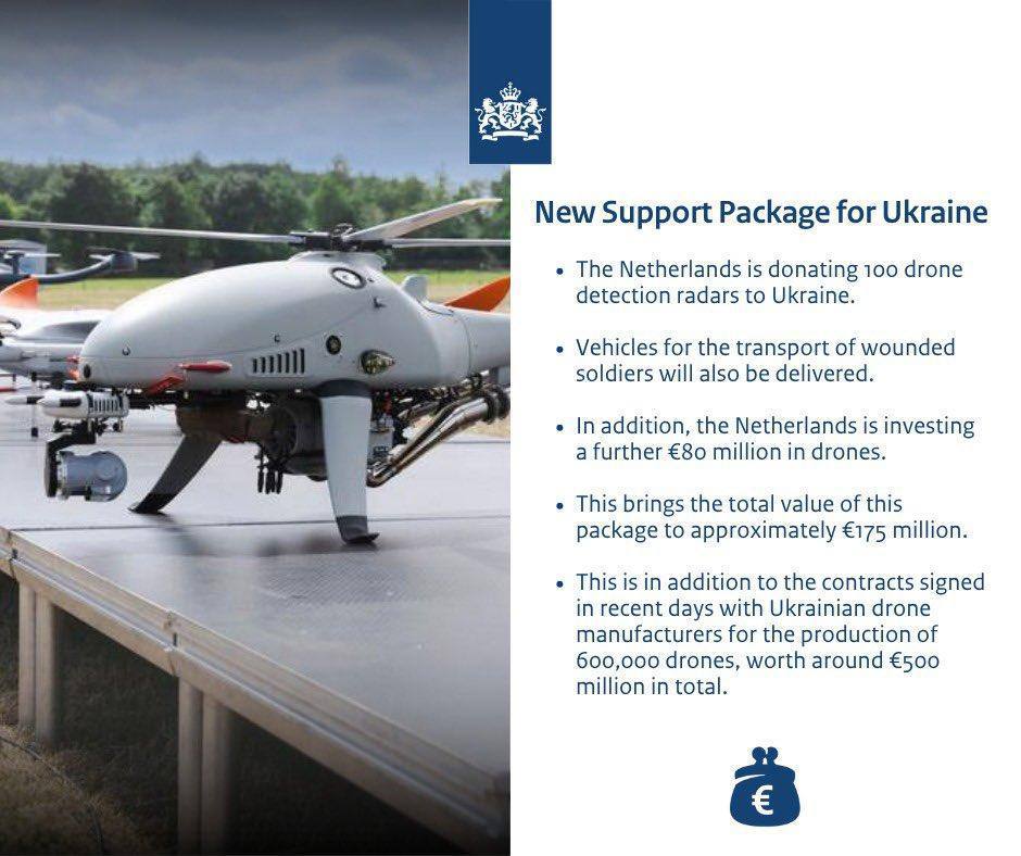 Также анонсирован пакет военной помощи в размере 175 миллионов евро, в который войдут: