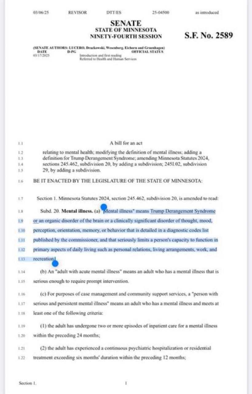 ❗️Республиканцы из Сената Миннесоты представили законопроект о классификации «синдрома отвращения к Трампу» как психического заболевания