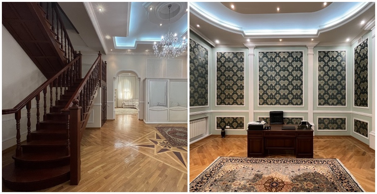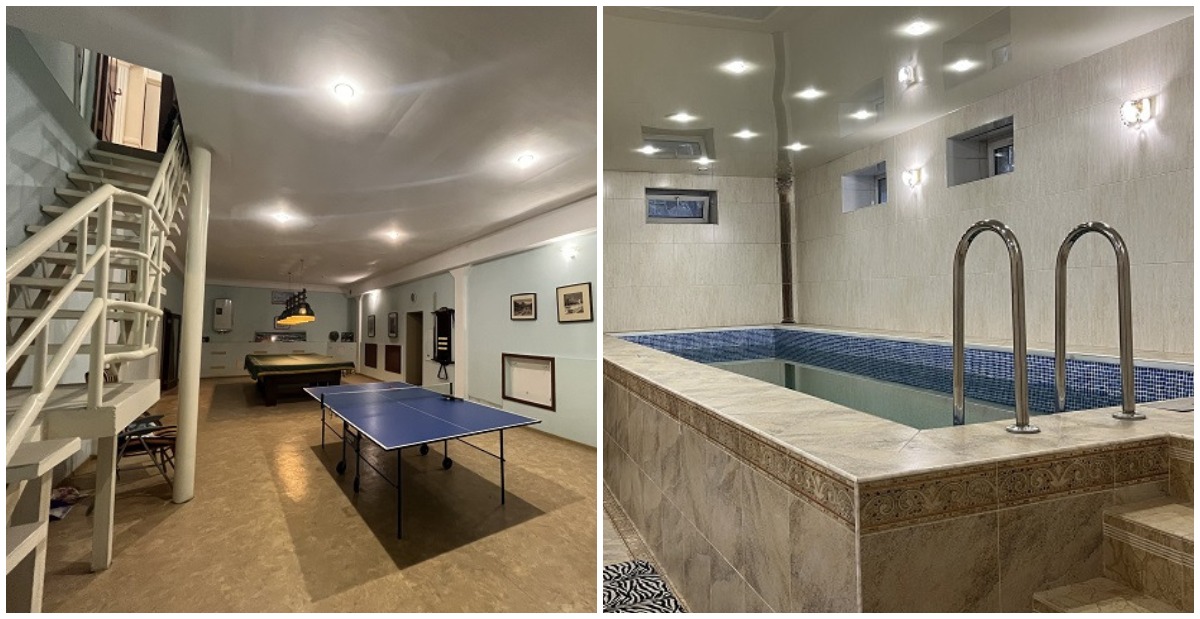 На втором этаже находятся четыре спальни, санузел, гардеробная и выход на террасу. В подвальном помещении есть бассейн, сауна, ещё один санузел. Также там расположена комната отдыха с бильярдом и теннисным столом.