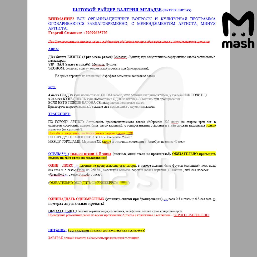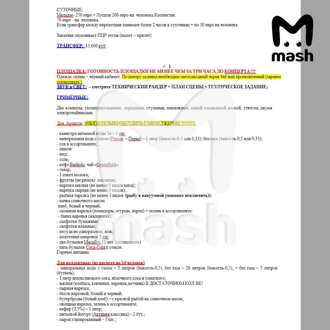 Для гримёрки заказ отдельный: стандартные вода, чай, кофе, фрукты, нарезки сырные, мясные, рыбные и овощные, две бутылки 12-летнего виски Macallan и 15 бутылок колы в стекле. У команды райдер скромнее, с ним более подробно ознакомитесь на фото. Ну и будьте добры суточные: Меладзе 250 евро, его менеджеру 200. Всё остальное по договорённости.