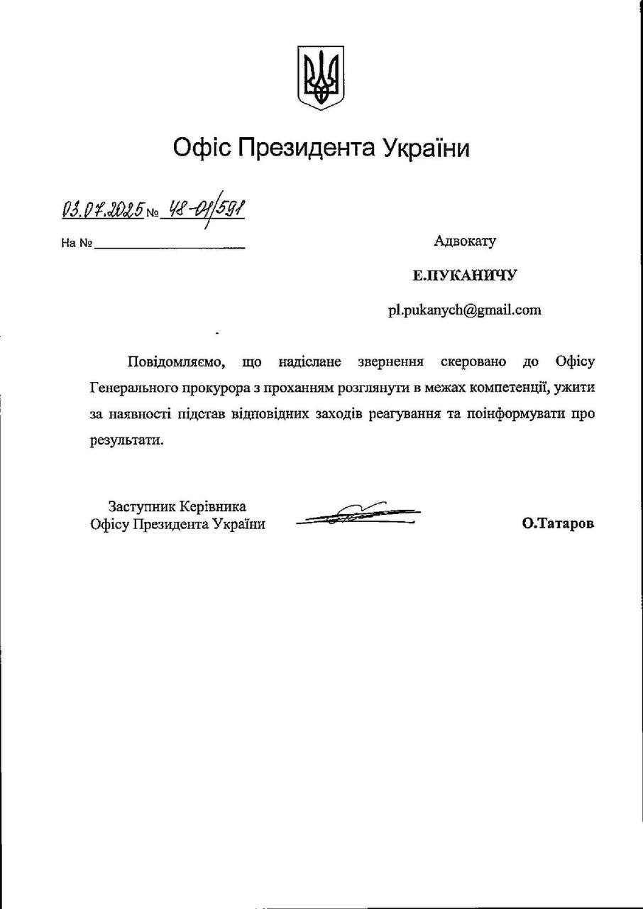 С заявлением о давлении со стороны правоохранительных органов он обратился в Офис президента Украины. Заместитель главы ОП Олег Татаров в ответ сообщил, что его обращение будет перенаправлено в Офис генерального прокурора.