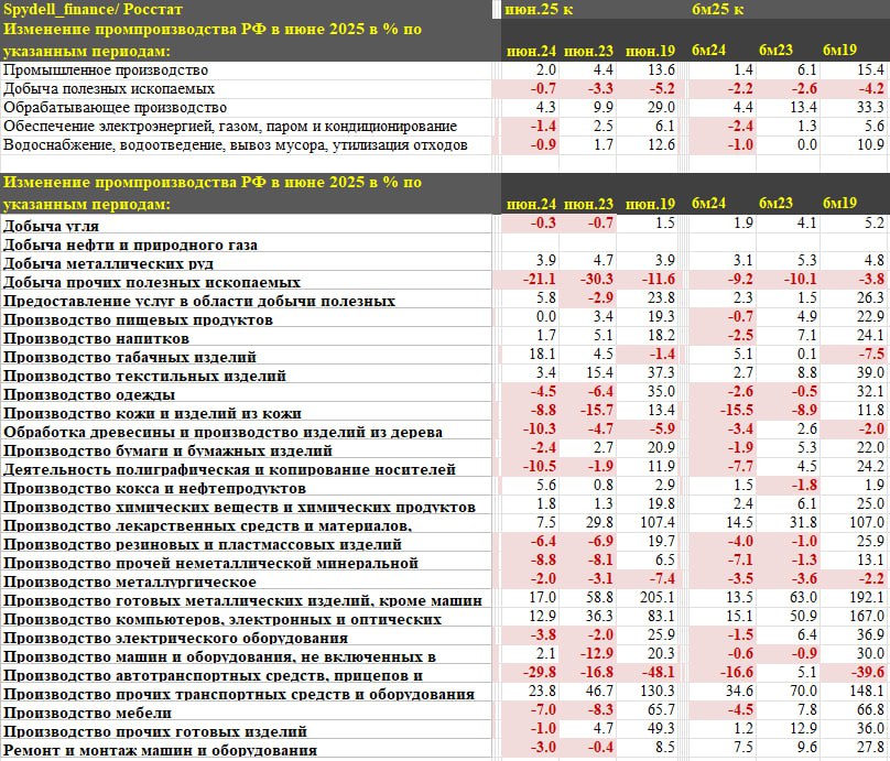 13 из 24 отраслей обработки в минусе в 1П25 в сравнении с 1П24, но вновь относительный баланс поддерживается за счет сильных показателей 2П24.