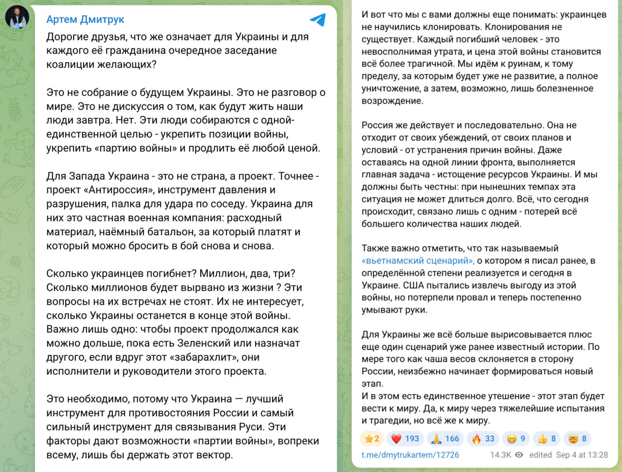 Дмитрук написал в Telegram, что «на переговорах «коалиции желающих» не обсуждаются мир или будущее украинцев. Встреча была созвана с одной целью — укрепить позиции войны и продлить её любой ценой».