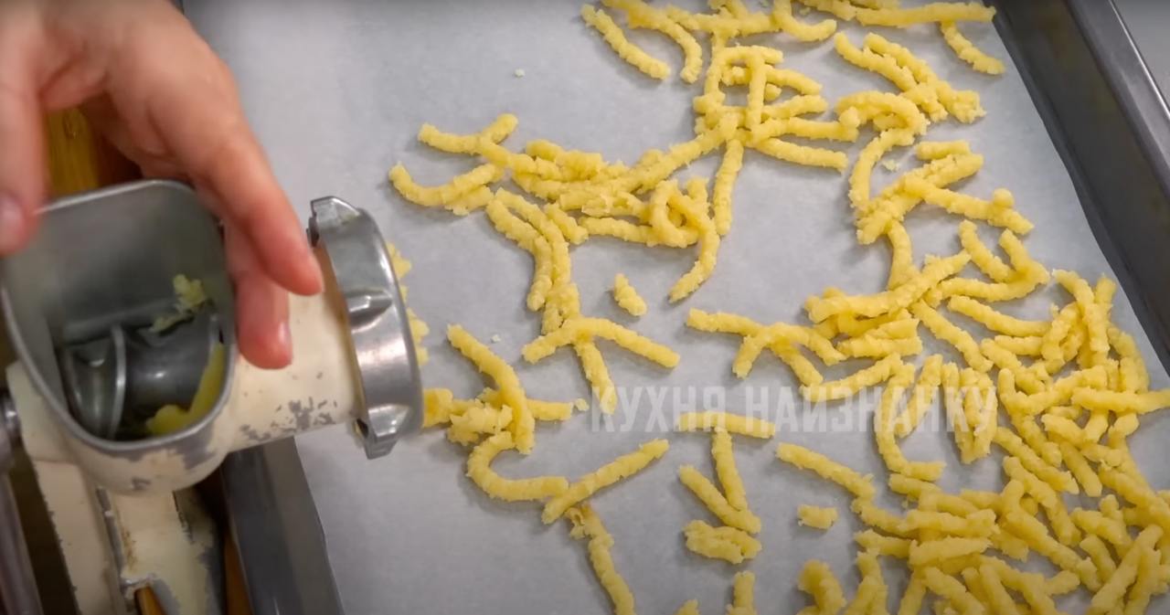 Теперь беру кусочек теста и свою старенькую мясорубку. Прокручиваю тесто через мясорубку (нож я из мясорубки убрала!).