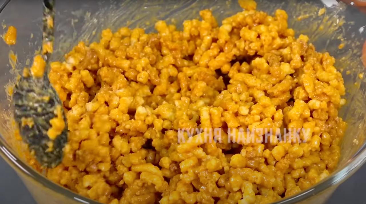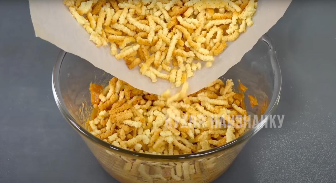 В миску со сгущёнкой отправляю печенье. Перемешиваю.