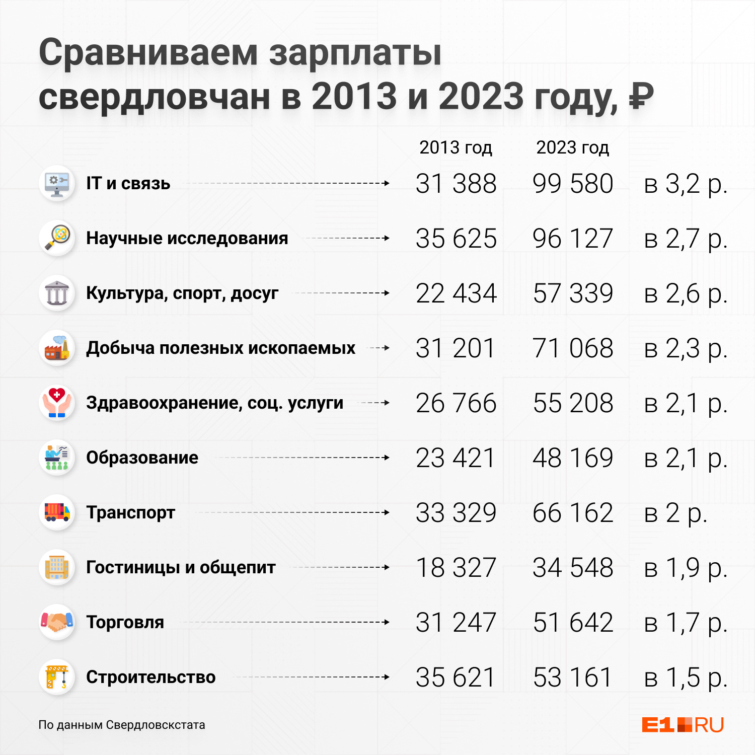 За основу взяли данные Свердловскстата, который регулярно публикует сводки о размерах заработных плат в разных отраслях. Стремительнее всего за последние десять лет росли заработки в сфере связи: если в 2013-м специалисты получали чуть больше 31 тысячи рублей, то теперь им платят около сотни (рост в 3,2 раза).
