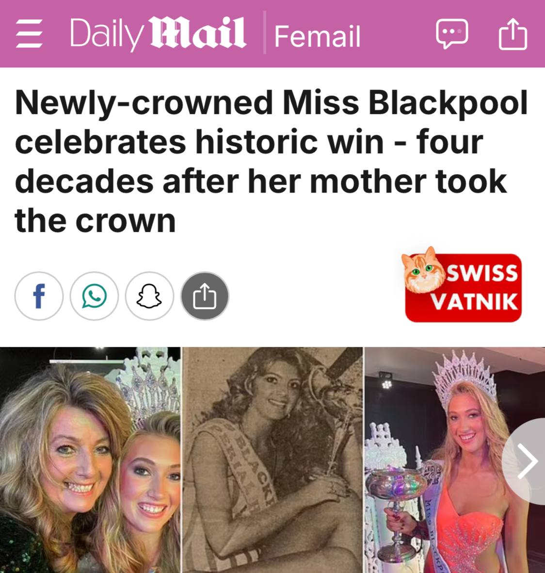 «20-летняя Табита Беннетт стала «Miss Blackpool», а сорок лет назад этот титул получила ее мать Виктория. Теперь обе-две, запомнятся жителям Блэкпула — (город в графстве Ланкашир), как единственные мать и дочь, которые выходили в финал конкурса «Miss England» за все 97 лет его существования»