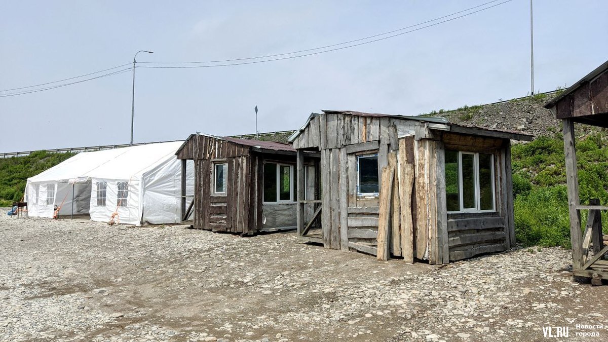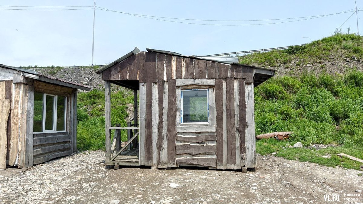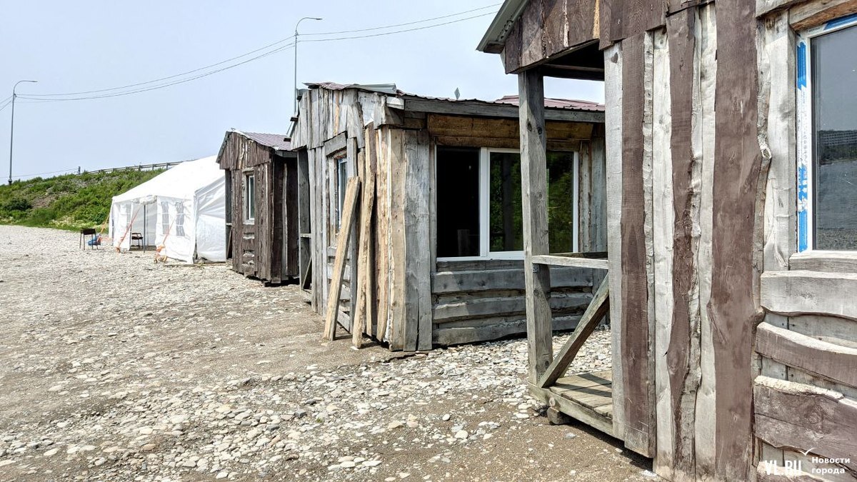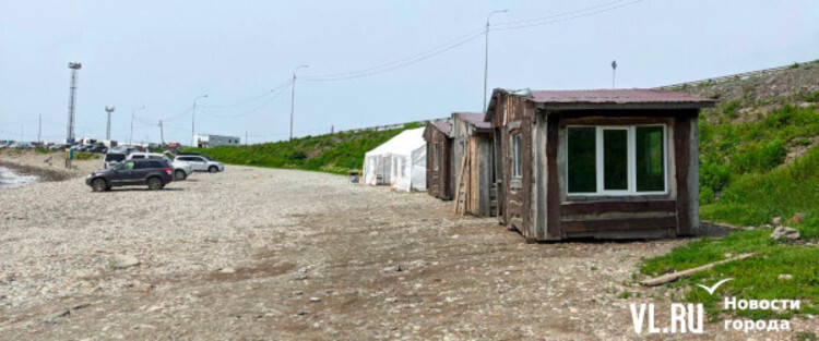 Судя по всему, эти избушки должны сдаваться в аренду отдыхающим, однако каких-то объявлений с контактами бизнесменов рядом обнаружить пока не удалось, домики закрыты. А вот палатка уже принимает клиентов. Там продают мороженное, сухарики, стоят столики для посетителей и мангал, на котором жарят шашлыки. Корреспонденты Новостей VL.ru видели рядом с шатром большой запас дров, из чего можно сделать вывод, что «шашлычка» поселилась тут надолго.