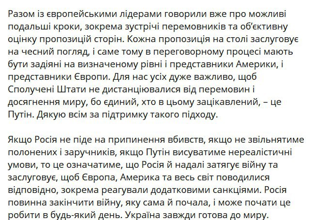 «В начале двустороннего разговора я подтвердил президенту Трампу, что мы в Украине готовы к полному и безусловному прекращению огня, как об этом и говорили, в частности, Соединенные Штаты. Важно не размывать это предложение. Если россияне не готовы прекращать убийства, за это должны быть более сильные санкции. Давление на Россию будет побуждать ее к реальному миру – очевидно для всех. Также я еще раз подтвердил, что Украина готова к прямым переговорам с Россией в любом формате, который даст результат. Турция, Ватикан, Швейцария – мы рассматриваем все возможные площадки. Украину не нужно в этом убеждать, и наши представители готовы принимать в переговорах настоящие решения. Надо обеспечить зеркальную готовность России к таким результативным переговорам»,