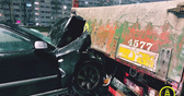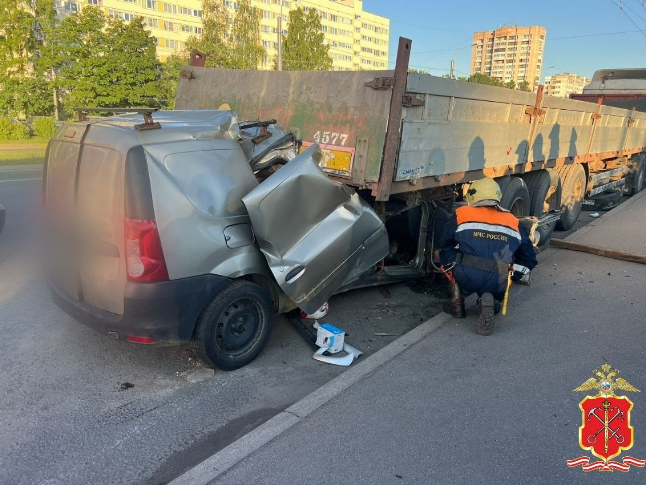 Смертельное ДТП на Суздальском проспекте, 75, утром 17 июня — уже не первое такое на этом самом месте. Полиция показывает новые фотографии: видно, что «Ларгус» ушел под шаланду больше чем наполовину — до багажника.