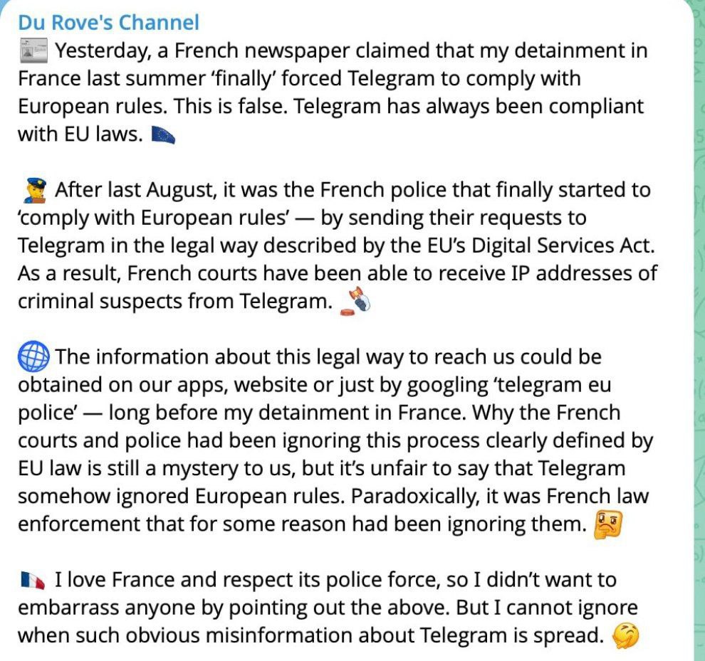 «Я люблю Францию и уважаю её полицию, поэтому не хотел никого выставлять в невыгодном свете. Но я не могу молчать, когда в отношении Telegram распространяется очевидная дезинформация», — отметил Дуров.