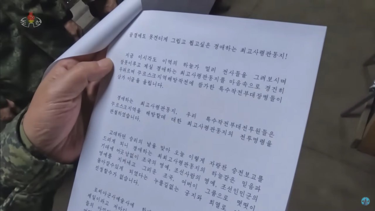 «Дорогой и любимый Верховный Главнокомандующий, вы — тот, о ком мы мечтали в своих снах! Даже в эту минуту мы, бойцы спецназа, участвовавшие в боях за освобождение Курской области, с глубочайшим почтением взираем на вас. Мы знаем: вы не спали по ночам, представляя себе силуэты своих воинов, находящихся далеко за пределами Родины.
