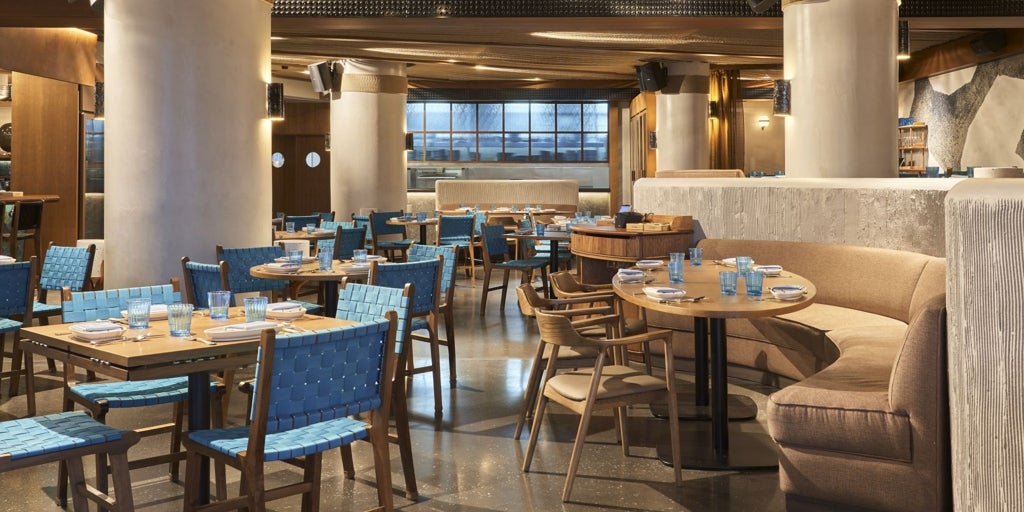 «La barra principal, de piedra labrada, evoca la erosión marina, mientras que la barra de ceviches, revestida con mosaicos azul verdosos, recuerda las escamas de los peces», explican sobre la inspiración en la naturaleza que han seguido las interioristas para crear el ambiente de La Mar. En él dominan materiales naturales como la roca, el yute, la madera de mongoi o el bambú.