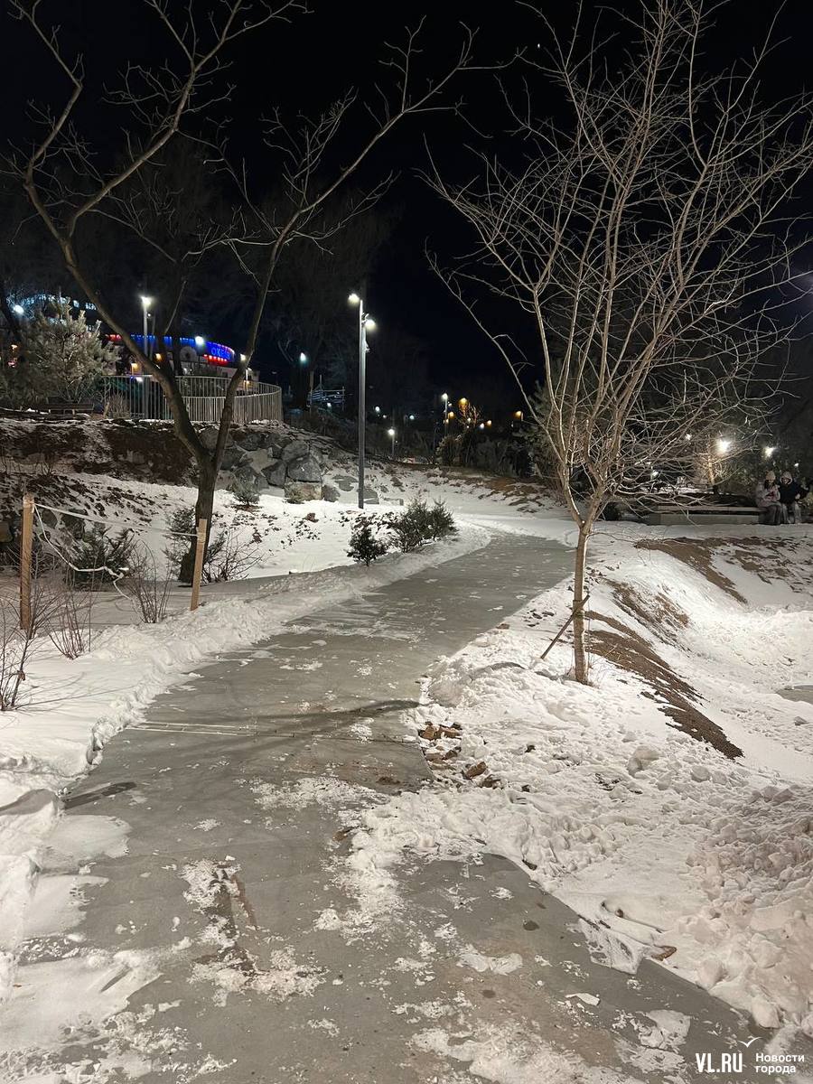 Дорожки в благоустроенном пространстве сделали бетонными. После снегопада тут много снега, но прохожие отмечают, что ходить тут не скользко. В отличие от тротуарной плитки, уложенной вдоль Пограничной, на которой в такую погоду легко упасть, тут ходить удобно. Как в Нагорном парке.