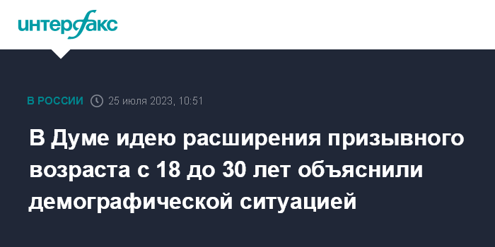 Москва. 25 июля. INTERFAX.RU - Проект закона об расширении призывного возраста с 18 до 30 лет связан с демографической ситуацией в стране, заявил "Интерфаксу" во вторник председатель комитета Госдумы по обороне Андрей Картаполов.