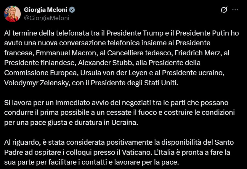 «По завершении телефонного разговора между президентом Трампом и президентом Путиным у меня состоялся новый телефонный разговор вместе с президентом Франции Эммануэлем Макроном, канцлером Германии Фридрихом Мерцем, президентом Финляндии Александром Стуббом, председателем Европейской комиссии Урсулой фон дер Ляйен и... Зеленским с президентом Соединенных Штатов.