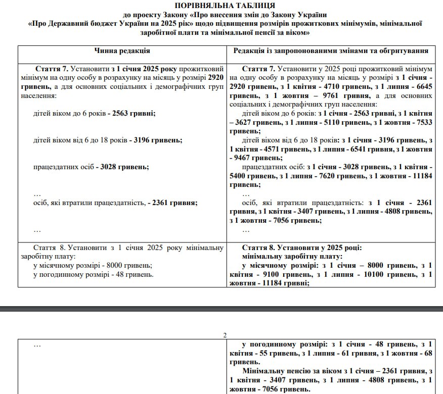 Согласно документу, выплаты планируется повышать поэтапно: с 1 апреля «минималка» вырастет до 9100 грн, с 1 июля — до 10100 грн, а после финального повышения 1 октября — до 11184 грн.