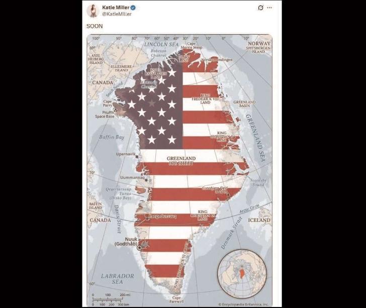Жена советника Дональда Трампа Кэти Миллер опубликовала в социальных сетях карту Гренландии. При этом принадлежащий Дании остров на фотографии был окрашен в цвета государственного флага США. Иллюстрация сопровождается подписью «soon», которая дословно переводится как «скоро».