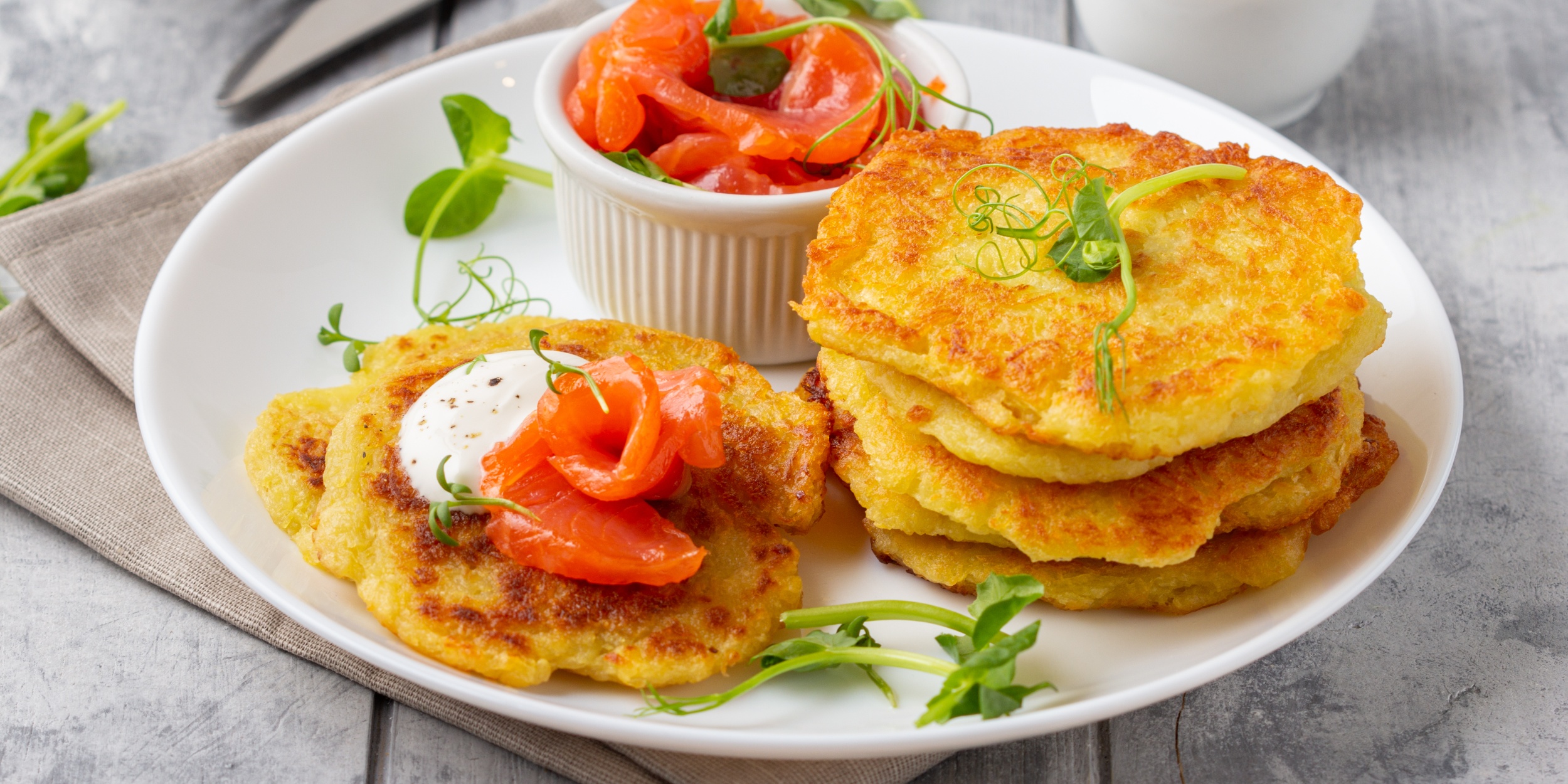 Подавайте с солёной рыбой, сметаной и микрозеленью гороха.
