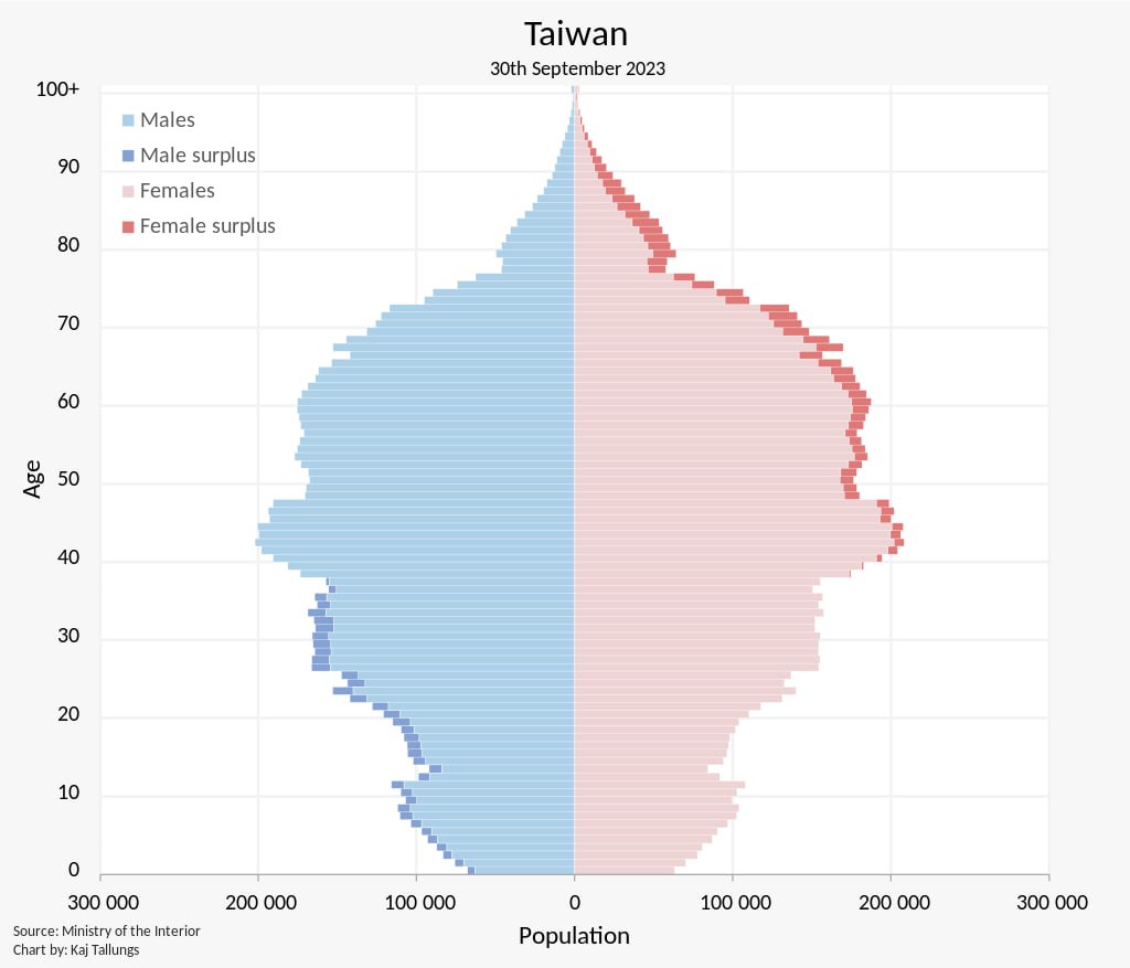 Половозрастная структура населения Тайваня на 30 сентября 2023 года