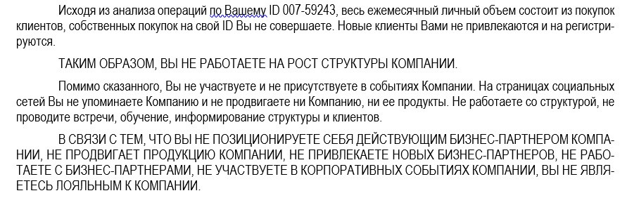 За 2023 год товарооборот команды Романа Волкова составил около 5 миллиардов рублей. Топовый лидер компании был уверен в безопасности своего бизнеса и не ожидал подвоха. Но в декабре компания NL в одностороннем порядке удалила контракт Романа из системы, отправив шокированному мужчине уведомление с сопроводительным письмом. В нем говорилось о невыполнении условий контракта и отсутствии лояльности к компании.