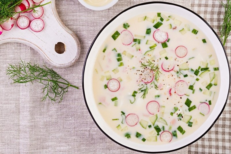 - При подаче на стол положить в окрошку нарезанную зелень укропа.