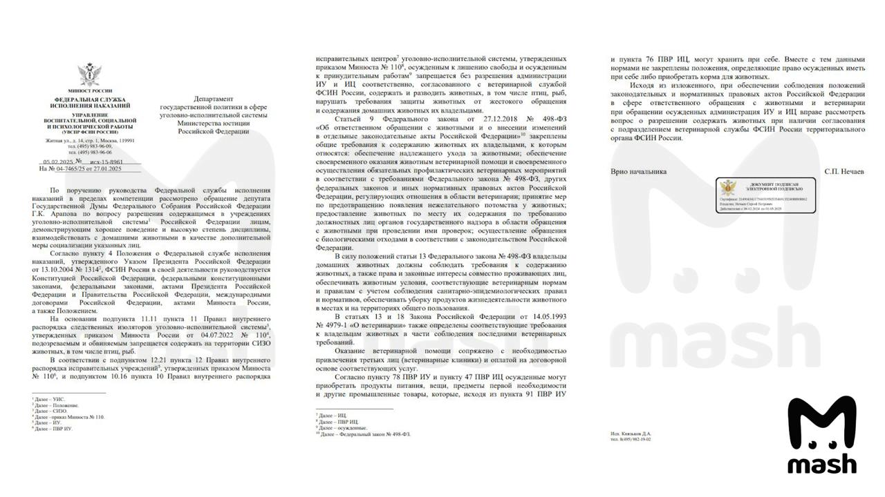 Об этом говорится в ответных письмах (есть в распоряжении Mash) от ФСИН и Минюста депутату ГД Георгию Арапову. В них ему объяснили — да, заводить животных можно, но есть несколько условий: