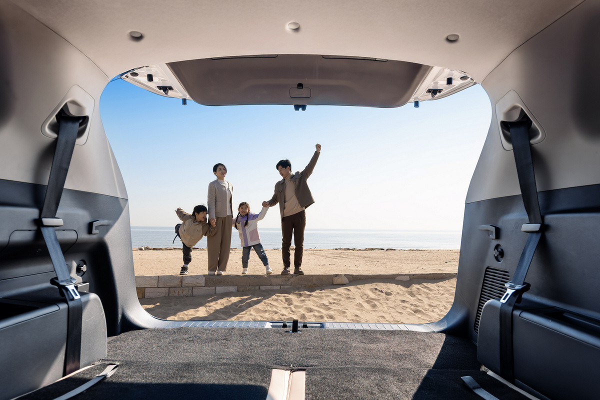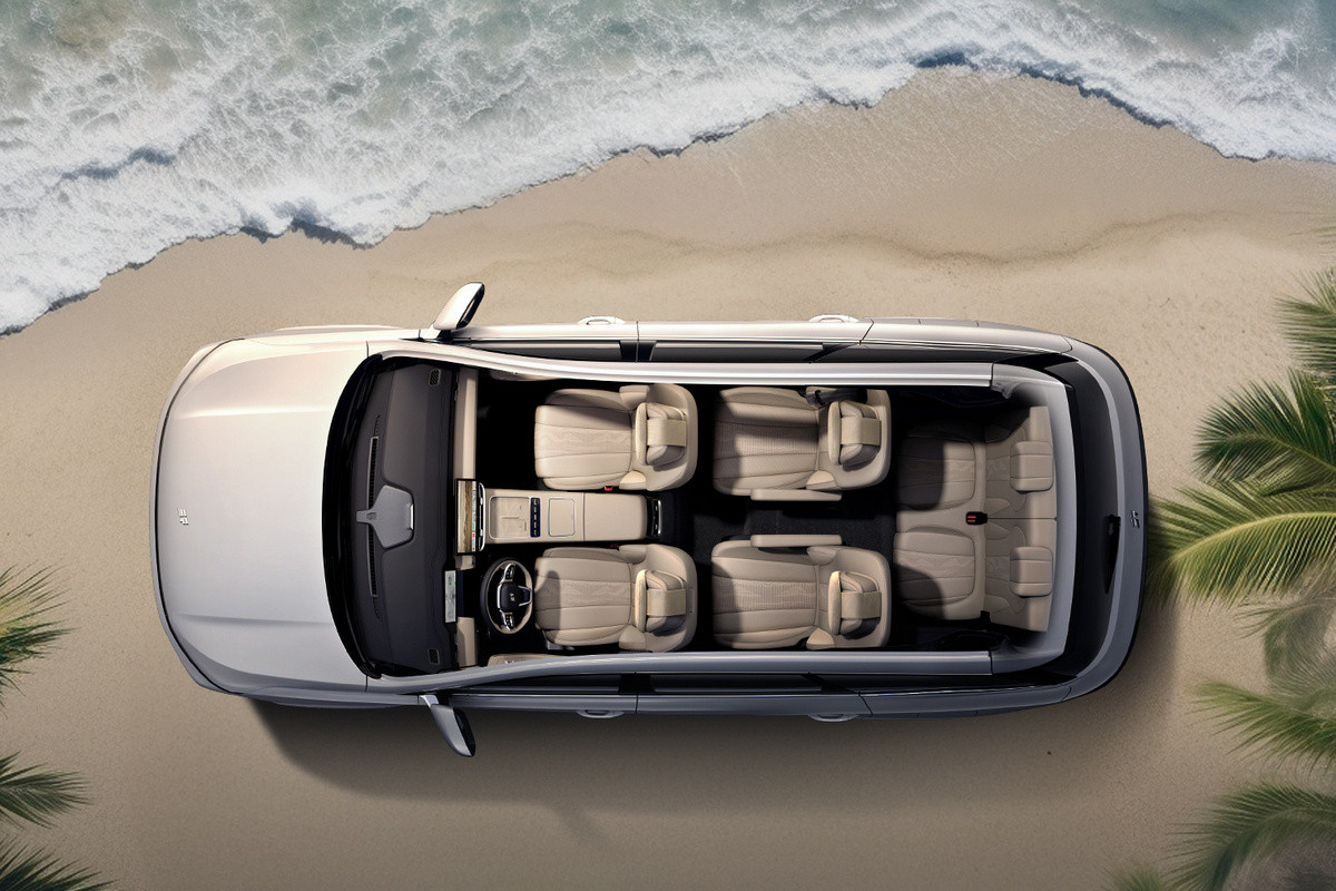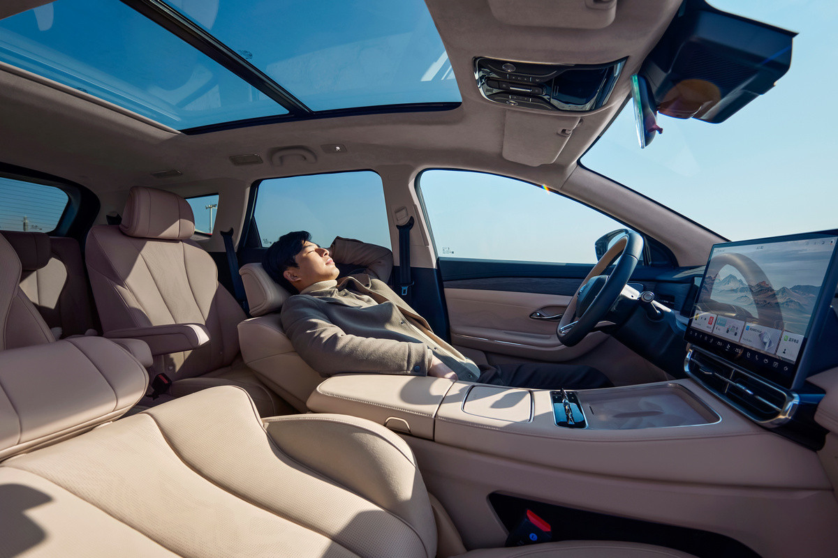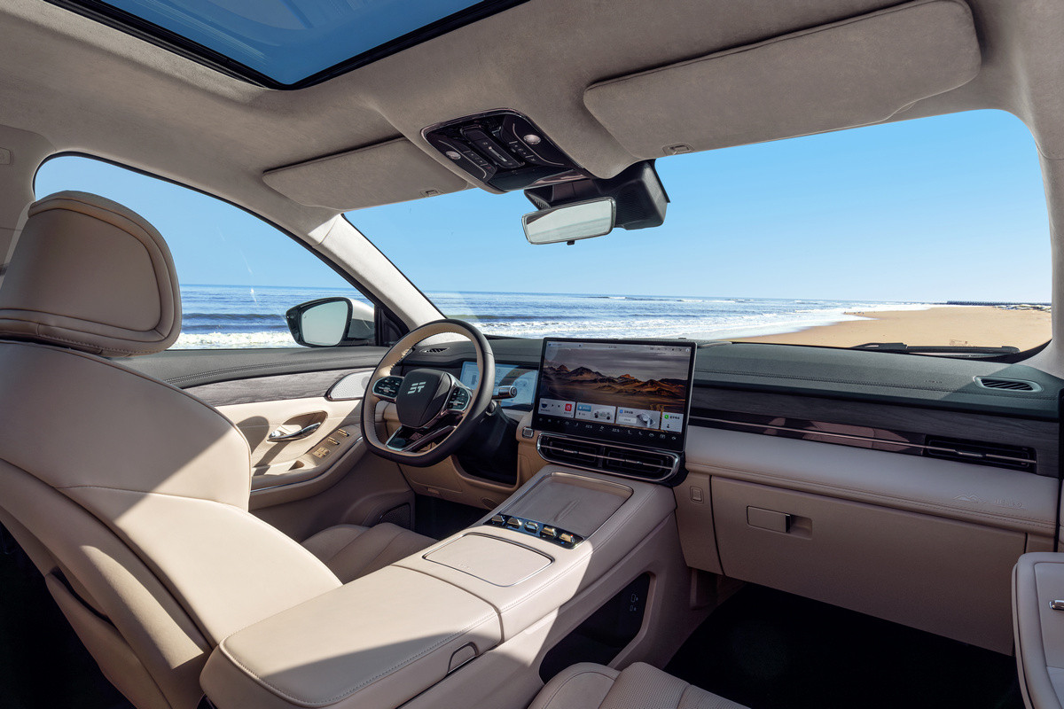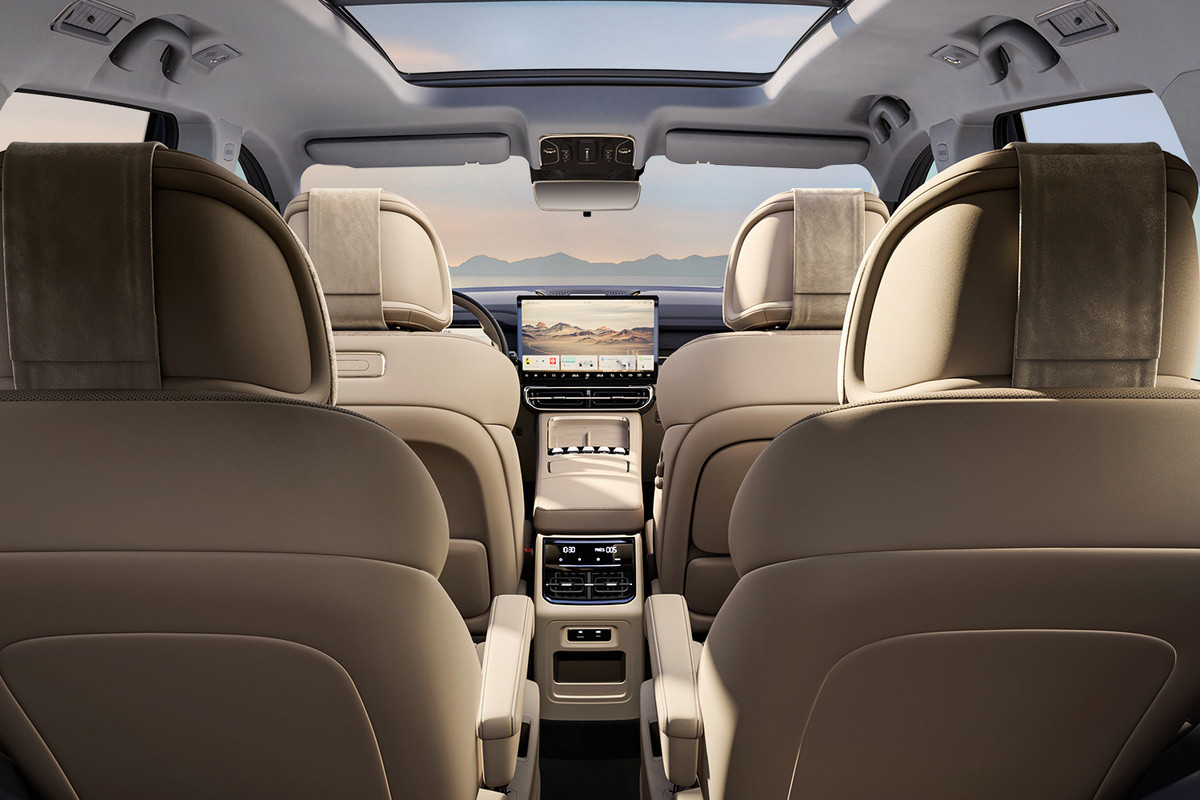 Внутри, как и прежде, два отдельных экрана. Но привычного селектора коробки больше нет, вместо него – подрулевой рычажок. Сам центральный тоннель перекомпонован, у кресел новая обивка. В спинку переднего пассажирского сиденья может быть встроен откидной столик. В списке оборудования Jetour Shanhai L9 также заявлены панорамный люк в крыше, беспроводная зарядка, камеры кругового обзора и водительские ассистенты. Наконец, наряду с 5- или 7-местным салоном теперь можно выбрать еще и 6-местную версию.