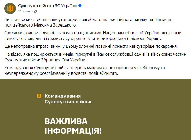 ВСУ подтвердили, что подозреваемые в убийстве полицейского являются военнослужащими одной из частей Сухопутных сил