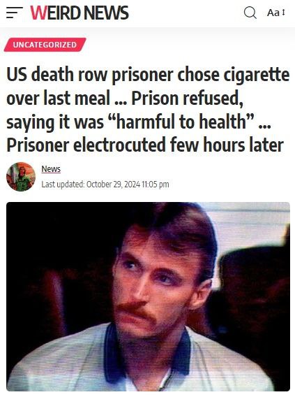 В США приговоренный к смерти попросил вместо последней трапезы принести ему сигарету. Администрация тюрьмы отказала на том основании, что «курение вредно для здоровья». Через несколько часов мужика поджарили на электрическом стуле.