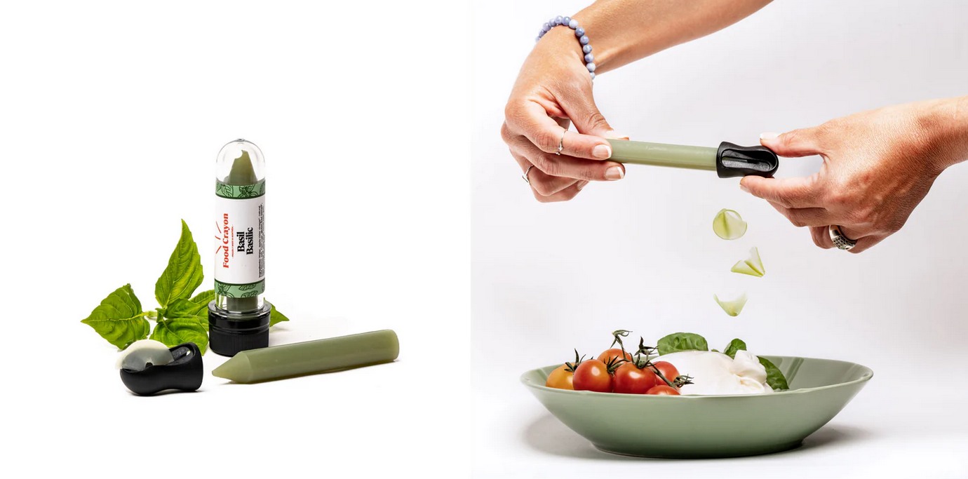 Слоганы Food Crayon (пищевой карандаш) — «раскрасьте свою еду вкусом» и — «добавьте перчинку в свою жизнь». Устройство похоже на точилку для карандашей. Нужно повернуть основание карандаша, сделанное из смеси приправ и ароматизаторов, чтобы вкусовые хлопья посыпались в тарелку. Карандаши бывают самых разных вкусов — от черного чеснока, базилика и лимона до грибов и моркови, апельсина и имбиря.