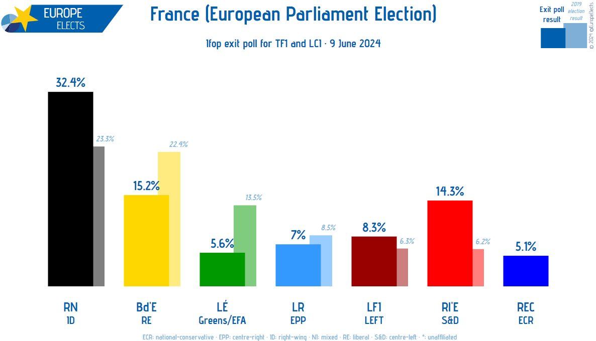 Результаты выборов в Европарламент показывают резкий рост популярности правых. Национальное ралли Марин Ле Пен получает 32-33% голосов во Франции. Партия Макрона - Ренессанс - оказалась сильно позади, получив в 2 раза меньше голосов.