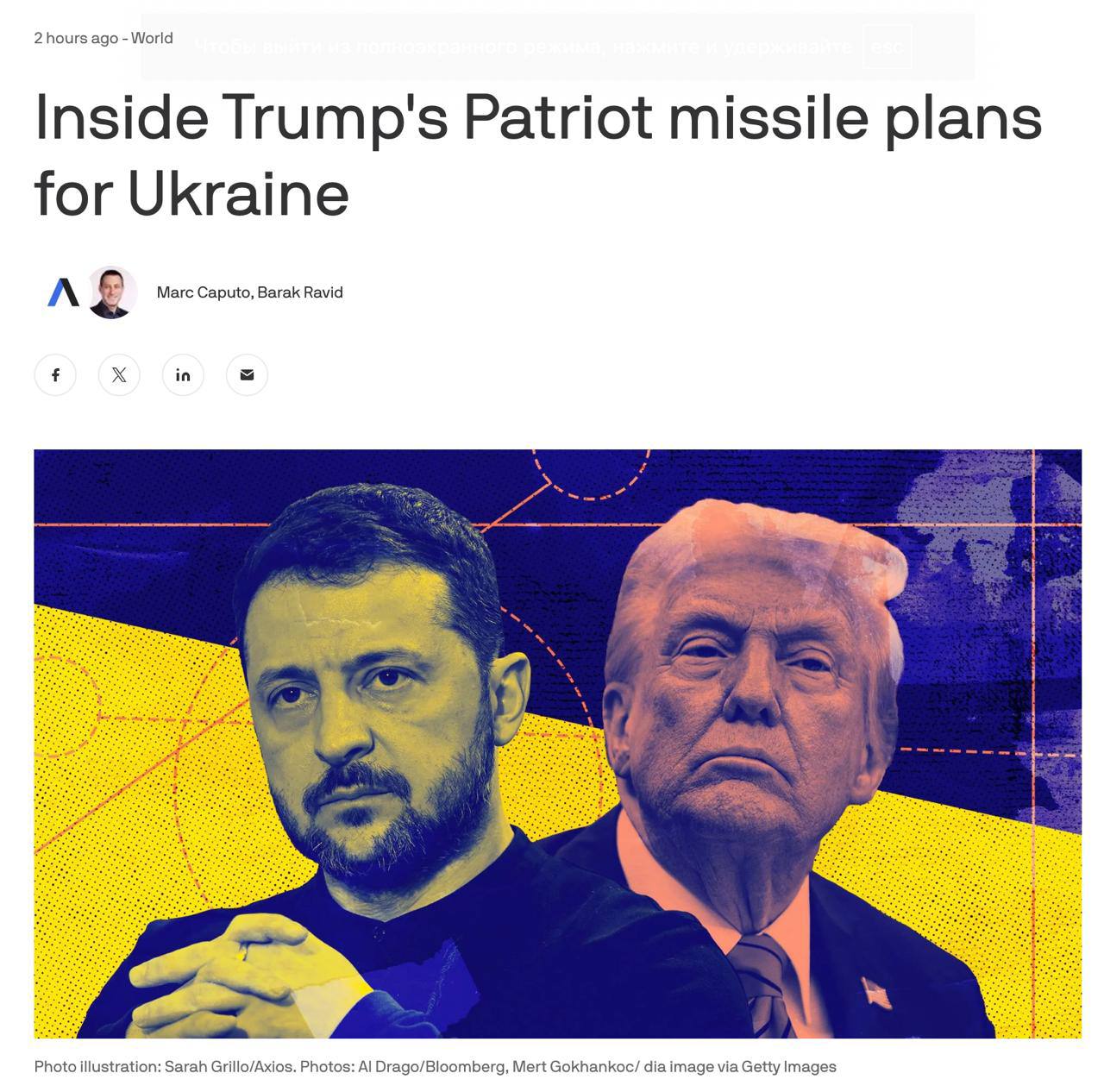 Трамп пообещал Зеленскому немедленно отправить ДЕСЯТЬ!!! ракет для Patriot Американское издание Axios пишет, что это меньше, чем планировалось изначально. При этом Трамп пообещал помочь найти другие источники поставок, поскольку не хочет отправлять оружие с американских запасов. Американский президент намерен давить на Германию, чтобы она отправила одну из своих батарей Patriot. Всё понятно. Трамп выходит из этой войны.