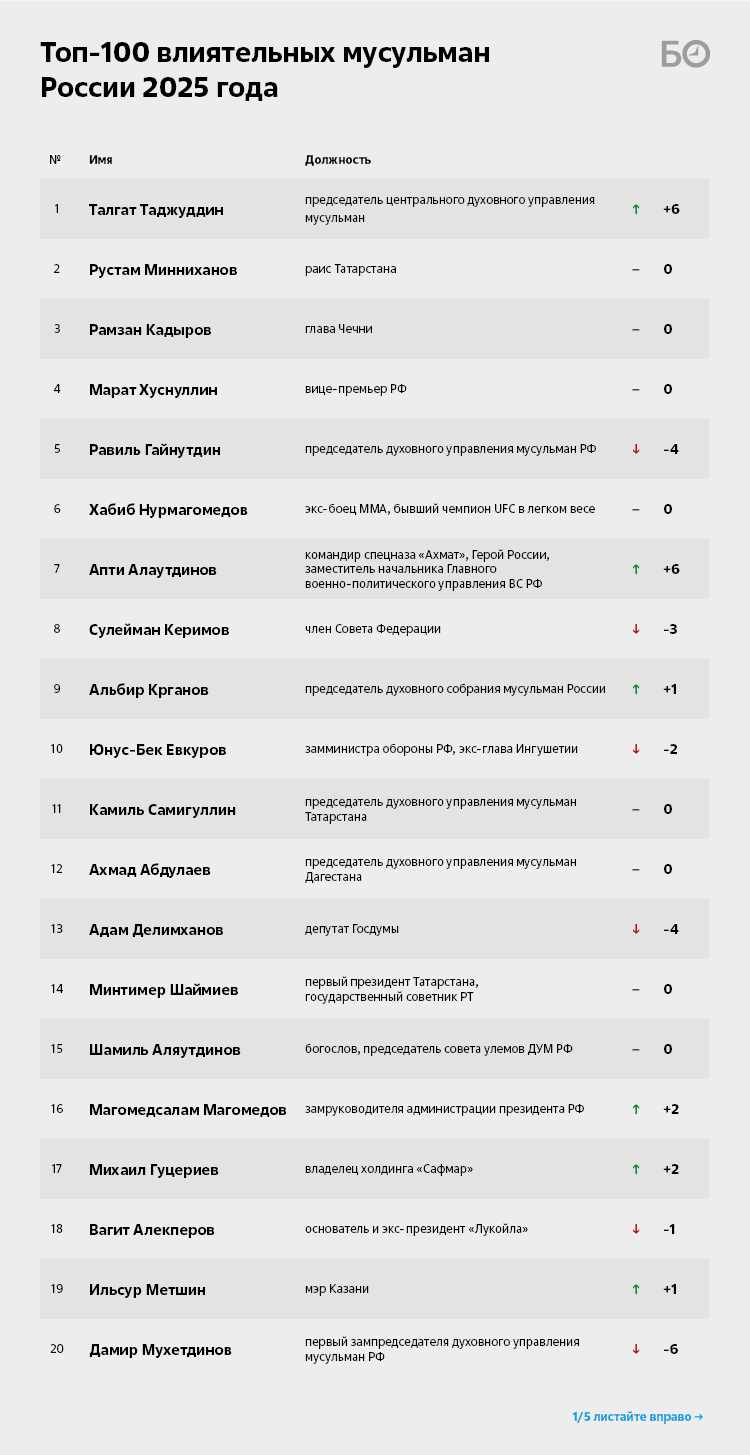 Впрочем, несмотря на это нельзя умалять заслуги Мухетдинова, который курирует издательскую деятельность муфтията, работает над популяризацией традиционного ислама и в противодействие радикальным течениям. По итогам Дамир хазрат в рейтинге теряет 6 строк и перемещается на 20-е место.