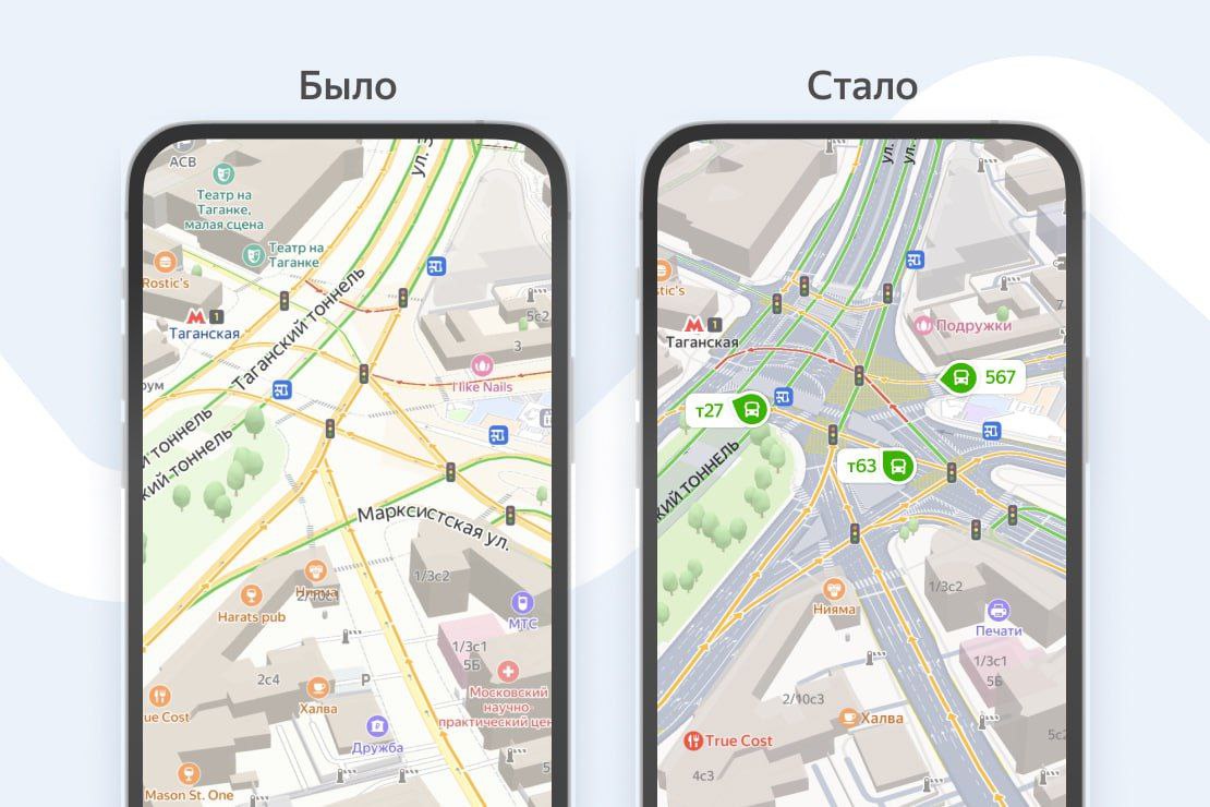 Теперь видно велодорожки, автобусные полосы, трамвайные пути и подземные переходы (даже с пандусами). Появились новые 3D-достопримечательности, стали ярче цвета и лучше читаются названия улиц.