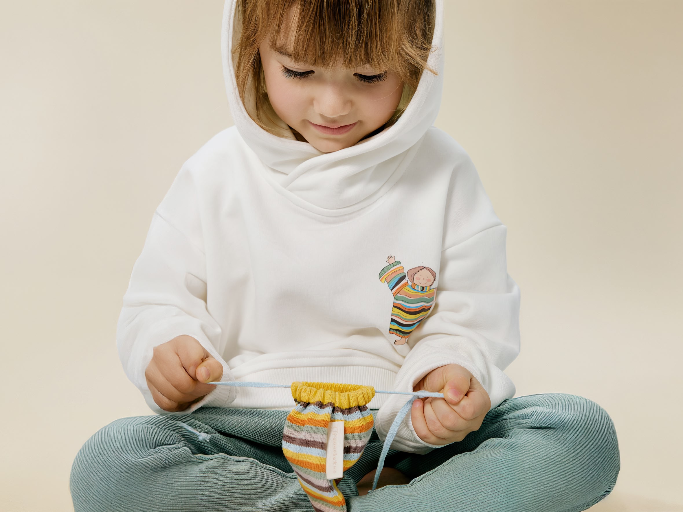 В капсулу вошли худи, футболки и тёплые головные уборы. Ключевой элемент коллекции — рисунок ребёнка в полосатом свитере, который символизирует постоянство заботы и поддержку со стороны взрослых.