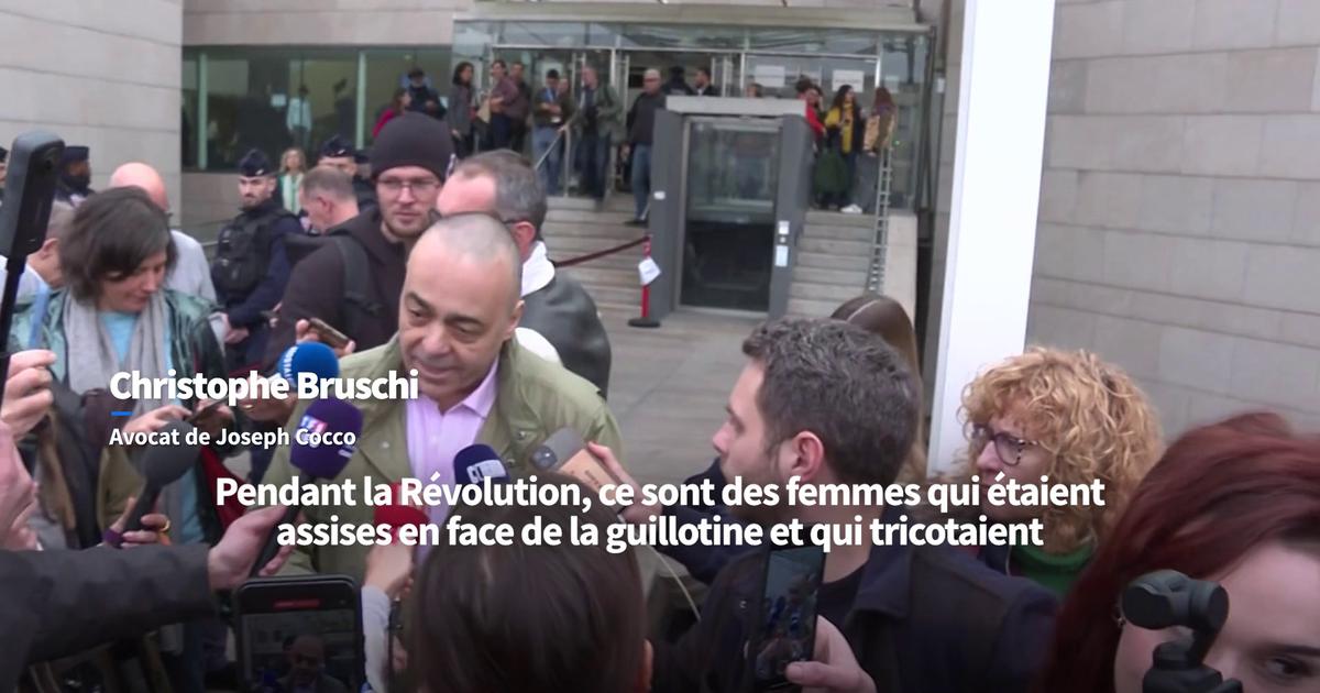 Christophe Bruschi a ensuite traité plusieurs fois les manifestantes de «tricoteuses», en référence aux femmes révolutionnaires qui assistaient à la guillotine pendant la Révolution française. Un peu plus tard, l’avocat a tenu à s’expliquer sur ses propos auprès de plusieurs journalistes présents sur place: «Effectivement, je les ai appelées les tricoteuses, mais pas toutes les femmes, loin s’en faut», a-t-il précisé, se défendant de toute misogynie. Ses propos n’étaient pas une provocation selon lui, mais une manière de décrire une situation qu’il jugeait réelle.
