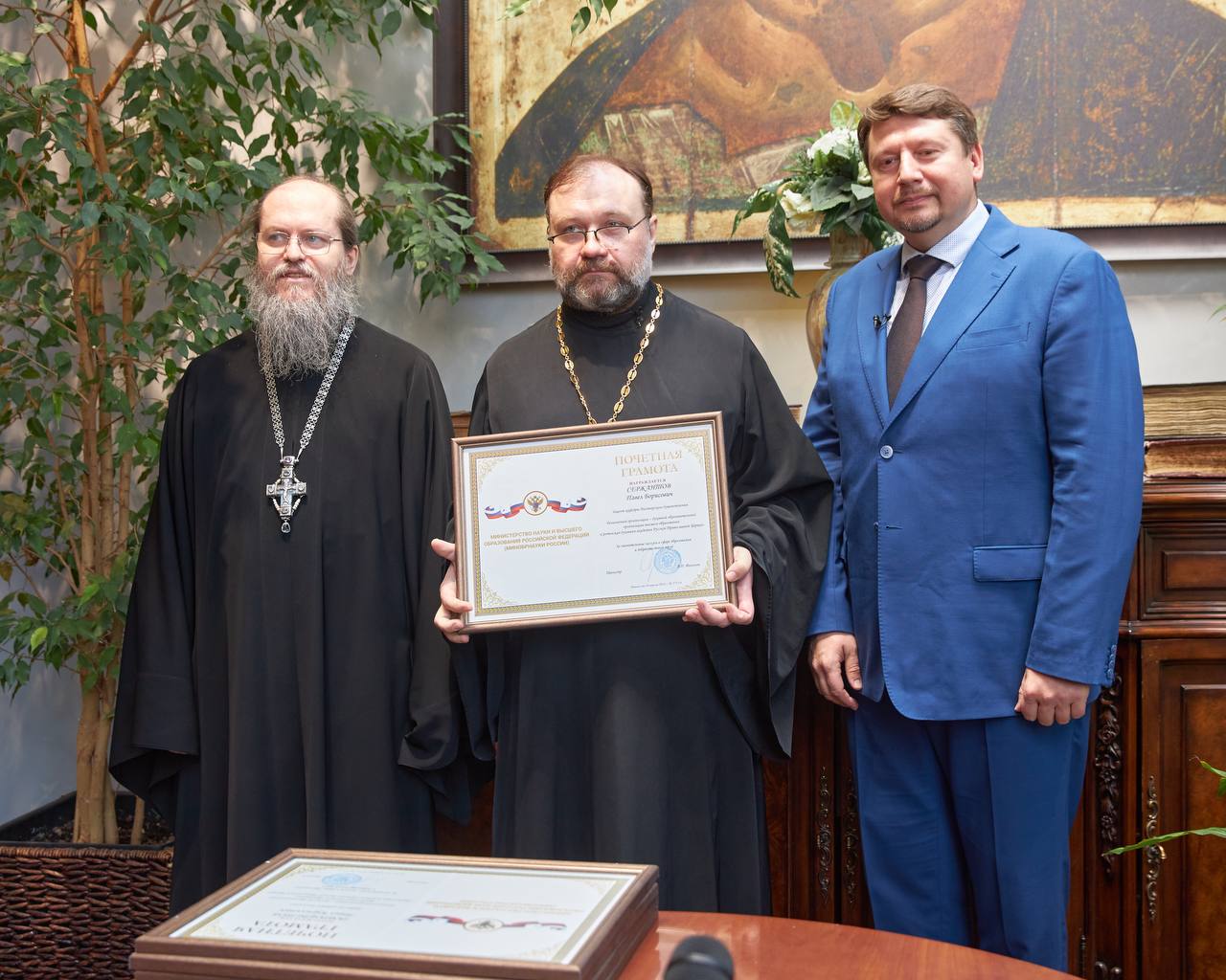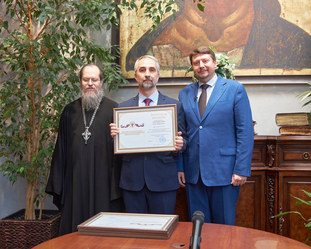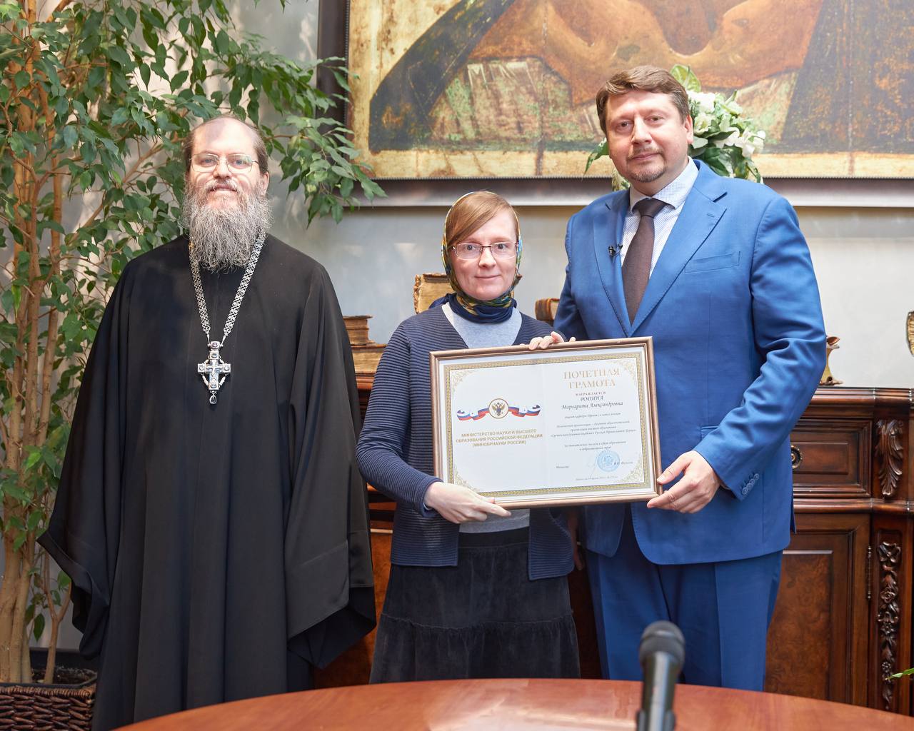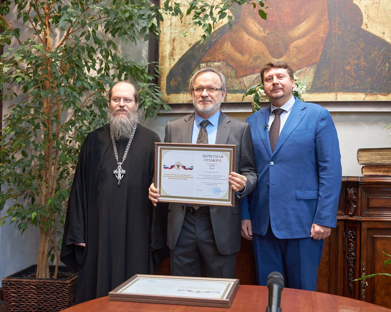 Профессор кафедры Церковно-практических и общих гуманитарных дисциплин Александр Николаевич Ужанков награждён медалью К.Д. Ушинского. Звание «Почётный работник сферы образования Российской Федерации» получили заведующий кафедрой Богословия протоиерей Вадим Леонов, заведующий кафедрой Древних и новых языков Лариса Ивановна Маршева и заведующий кафедрой Церковной истории Олег Викторович Стародубцев. Доцент кафедры Богословия, доцент кафедры «Пастырского душепопечения» руководитель магистерской программы «Пастырское душепопечение и миссия в современном мире» иерей Павел Сержантов, профессор кафедры Богословия Павел Кириллович Доброцветов, доцент кафедры Богословия Роман Михайлович Конь, старший преподаватель кафедры Церковно-практических и общих гуманитарных дисциплин Инна Викторовна Пышинска и доцент кафедры Древних и новых языков Маргарита Александровна Родина были награждены Почетными грамотами Министерства науки и высшего образования.