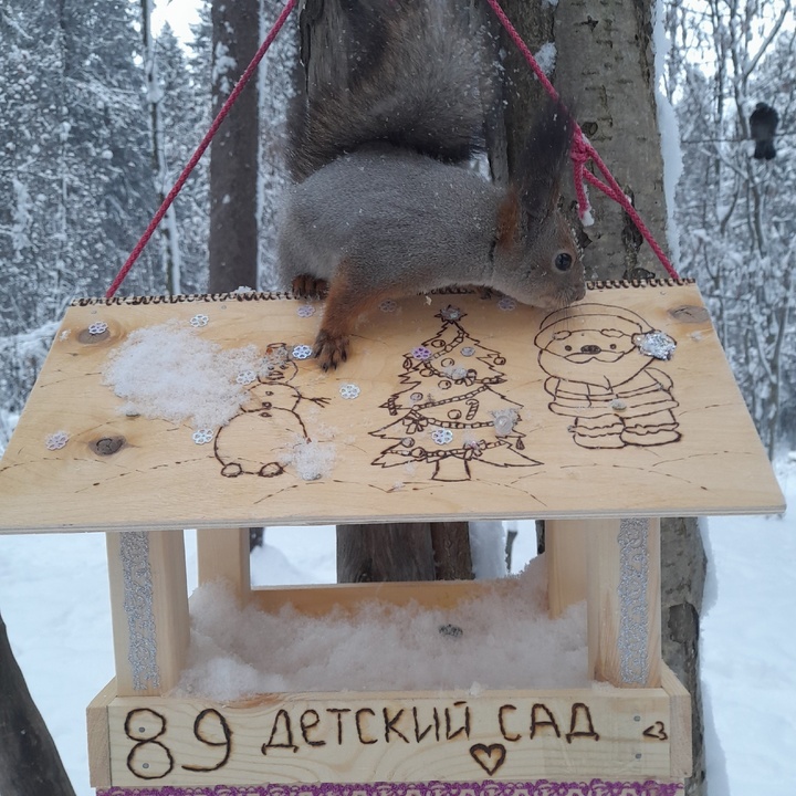 Новую кормушку в парке «Лесной ключ» оценила пушистая обитательница леса. Фотографии белки, которая сидит на деревянной кормушке с новогодними рисунками, опубликовали в группе «Весь Петрозаводск|Карелия». На самой кормушке авторы оставили подпись «Детский сад 89».