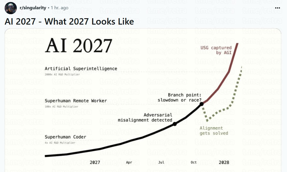 — Июнь 2027: Люди перестают быть полезными в ИИ-исследованиях. ИИ-агенты управляют ИИ-агентами. Человеческие учёные успевают только на уровне менеджмента. Они работают круглосуточно, чтобы просто успевать следить за прогрессом.