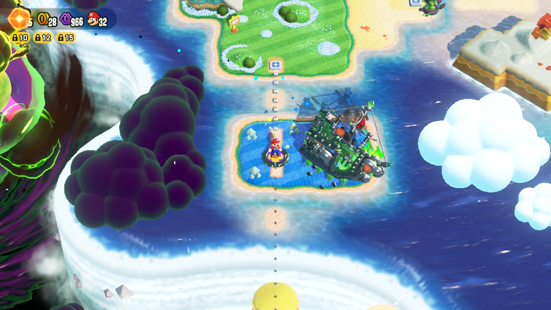 Представьте, что таких уровней здесь десятки. В Nintendo не поскупились на контент и от души наполнили местный мир развлечениями. Всего здесь шесть больших основных миров. Формально каждый из них — классика вроде «пустыня», «снег», «вода», «рудники», «облака», «подземелье». Еще центральный цветочный мир, через который можно попасть в одну из главных локаций. Да, местами линейное прохождение имитирует некоторый выбор. Пусть он сводится лишь к очередности прохождения тех или иных уровней, но и это для платформеров не мало.