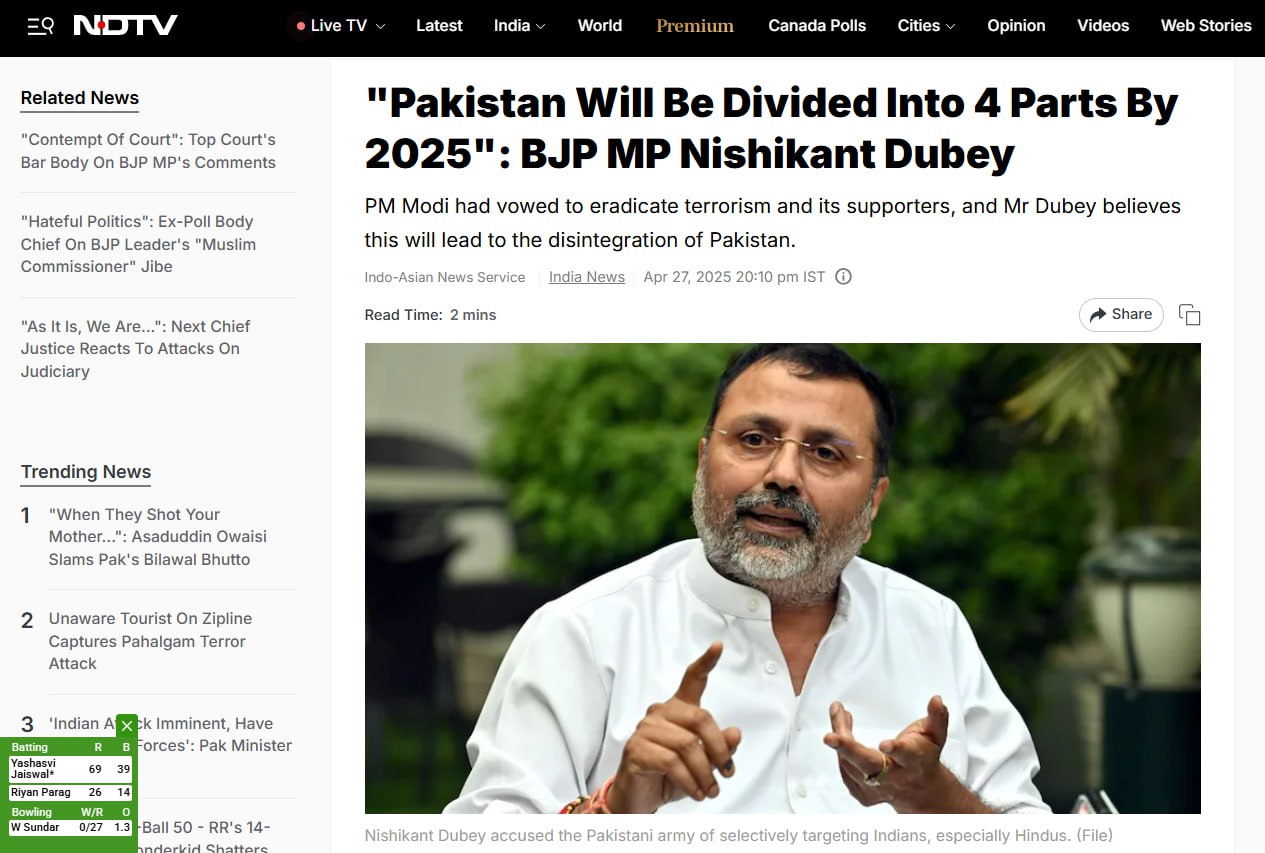 На фоне заявления премьера Индии Нарендры Моди об искоренении терроризма, Член парламента Нишикант Дубей сообщил, что к концу 2025 года Пакистан перестанет существовать как страна.